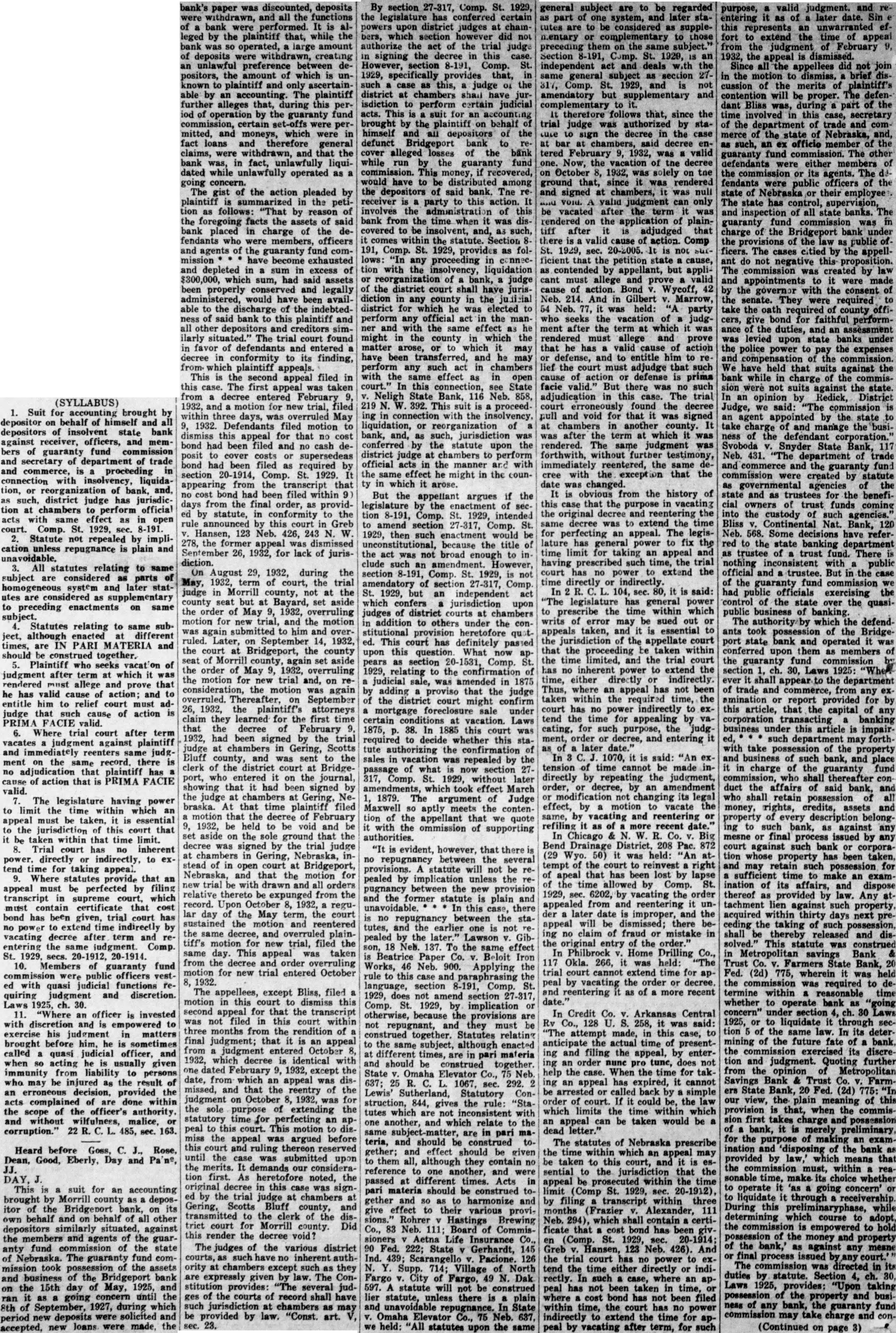 (SYLLABUS) Suit for accounting brought by depositor on behalf of himself and all depositors of insolvent state bank against receiver, officers, and members of guaranty fund commission and secretary of department of trade and commerce, is proceeding in connection with insolvency, liquidation, or reorganization of bank, and, such, district judge has jurisdiction at chambers to perform acts with same effect as in open court. Comp. St. 1929, sec. 8-191. Statute not repealed by implication unless repugnance is plain and unavoidable. 3. All statutes relating to same subject are considered as parts homogeneous system and later utes are considered supplementary to preceding enactments on same subject. Statutes relating to subject, although enacted at different times, are IN PARI and should be construed together. Plaintiff who seeks of judgment term at which was rendered must allege and prove that he has valid cause of action; and to entitle him to relief court must judge that such cause of action FACIE valid. Where trial court after term vacates judgment against plaintiff and immediately reenters same judgment on the same record. there no adjudication that plaintiff cause action that valid. The legislature having power to limit the time within which appeal must be taken, essential to the jurisdiction of this court that be taken within that time limit. Trial court has no inherent power. directly or indirectly, to tend time for taking appeal. 9. Where statutes provide that an appeal must be perfected by filing transcript in supreme court, which must contain certificate that cost bond has been given, trial court has to extend time indirectly by vacating decree after term and entering the same judgment. Comp. 1929, 10. Members of guaranty fund commission were public officers vestwith quasi judicial functions quiring judgment and discretion. Laws 1925, 11. an officer is invested with discretion and is empowered exercise his judgment in matters brought before him, he is sometimes called quasi judicial officer, and when so acting he is usually given immunity from liability to persons who may be injured as the result an erroneous decision, provided the acts complained of done within the scope of the officer's authority. and without wilfulness, malice, corruption." 485, sec.