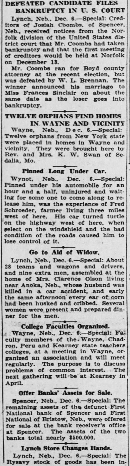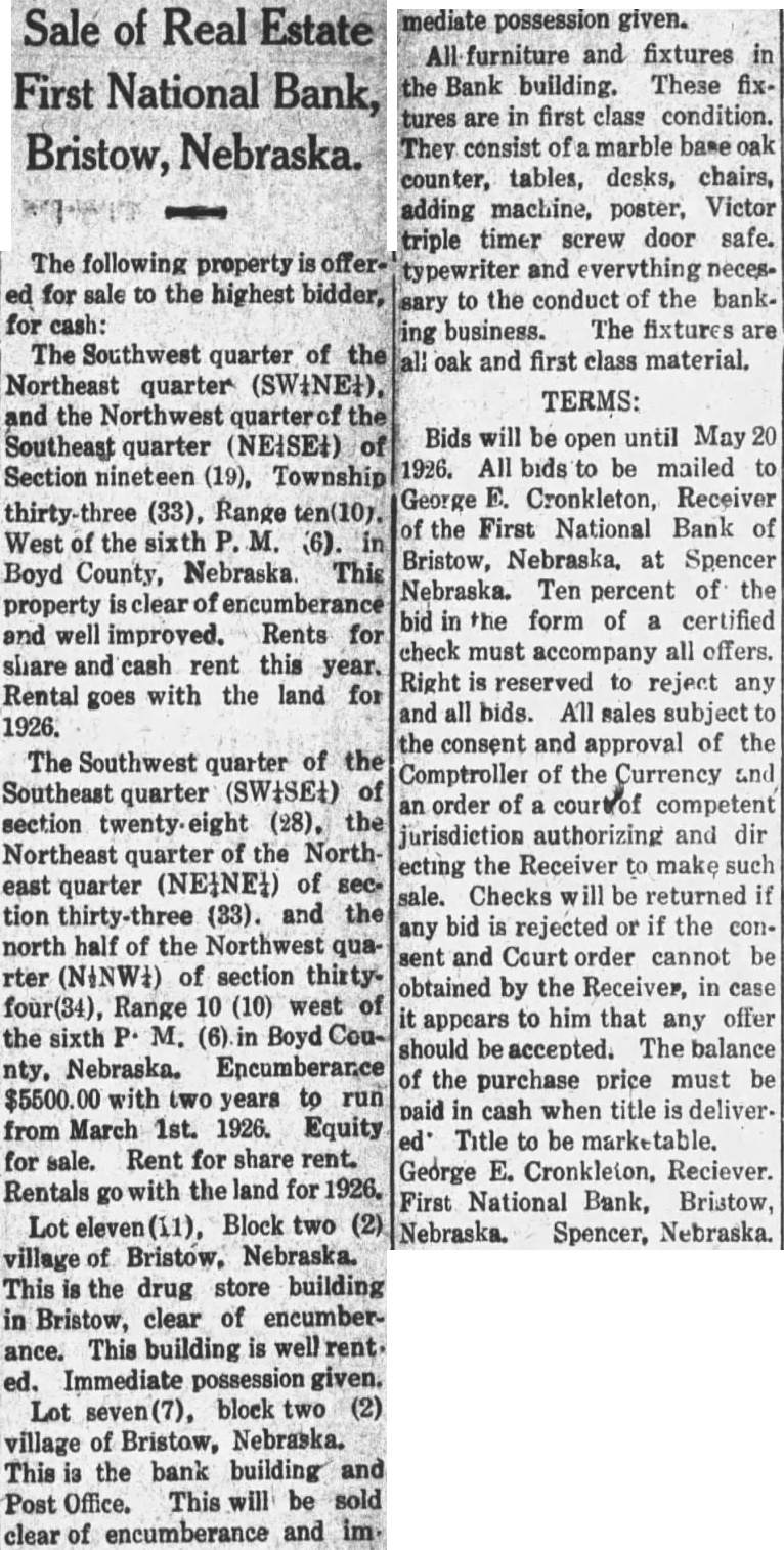 Bank's Affairs Wound Up. Bristow, Neb., May 10.-Special: George Cronkleton, receiver of the First National bank at Bristow, and also of the bank Spencer, has wound up the affairs at both places. few records from the Spencer bank he took him to Wausa, Neb., where he is receiver for bank there. The trust is closed. That bank paid more than one-half to its creditors.