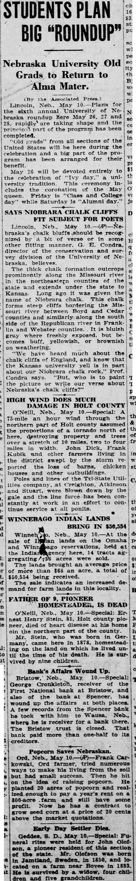 HIGH WIND DOES MUCH DAMAGE IN HOLT COUNTY O'Neill, Neb., May 10.-Special: 75-mile an hour wind through the northern part of Holt county assumed the proportions tornado north of here, destroying property and trees stretch 10 miles, two four miles width. John Dick, Frank Kubik and other farmers living the district swept by the storm reported the loss of chicken houses and other outbuildings. Poles and lines of the Utilities company, Creighton, Atkinson and Stuart, were blown down by the gale and the line force has been constantly at work in an effort to continue service at all ponits.