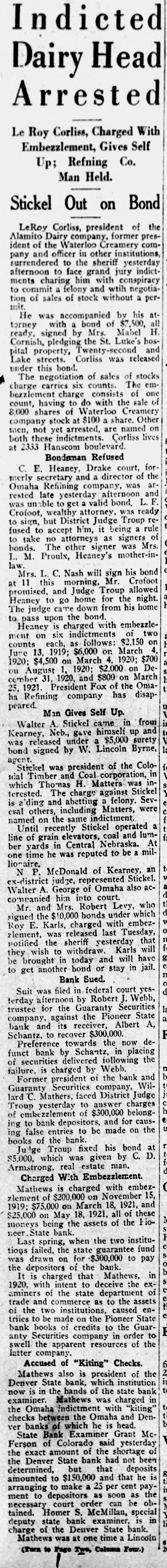 Indicted Dairy Head Arrested Le Roy Corliss, Charged With Embezzlement, Gives Self Up; Refning Co. Man Held. Stickel Out on Bond LeRoy Corliss, president of the Alamito Dairy company, former president of the Waterloo Creamery company and officer in other institutions surrendered to the sheriff yesterday afternoon to face grand jury indictments charing him with conspiracy to commit felony and with negotia tion of sales of stock without a permit. He was accompanied by his at torney with bond of $7 500, all ready, signed by Mrs Mabel H Cornish, pledging the St. Luke's hospital property, Twenty-second and Lake streets. Corliss was released under this bond The negotiation of sales of stocks A charge carries six counts The embezzlement charge consists of one count, having to do with the sale of 8.000 shares of Waterloo Creamery company stock at $100 a share. Other men, not yet arrested, are named on both these indictments Corliss lives at 2333 Hanscom boulevard Bondaman Refused C. E. Heaney, Drake court, for merly secretary and director of the Omaha Refining company, was rested late yesterday afternoon and F was unable to get valid bond, L. Crofoot, wealthy attorney, was ready to sign, but District Judge Troup refused to accept him, it being rule to take no attorneys as signers of bonds The other signer was Mrs. L. M. Proulx, Heaney's mother-inlaw Mrs. L C. Nash will sign bis bond at 11 this morning, Mr. Crofoot promised, and Judge Troup allowed Heaney to go home for the night The judge came down from his home to pass upon the bond Heaney is charged with embezzlement on six indictments of two counts each, as follows $2,150 on Jure 13, 1919; $6,000 on March 4. 1920; $4,500 on March 4. 1920 $700 on August 1920: $2,000 on De cember 31 1920, and $800 on March 25, 1921 President Fox of the Omaha Refining company has disap peared. Man Gives Self Up. Walter A. Stickel came in from Kearney, Neb., gave himself up and was released under a $5,000 surety bond signed by W. Lincoln Byrne agent. Stickel was president of the Colo trial Timber and Coal corporation, in which Thomas H. Matters was interested The charge against Stickel is a'ding and abetting felony Several others, including Matters, were named on the same indictment a Until recently Stickel operated line of grain elevators, coal and lumber yards in Central Nebraska. At one time he was reputed to be millionaire, N P. fcDonald of Kearney, an ex-district judge, represented Stickel. Walter A George of Omaha also accompanied him into court. Mr and Mrs. Robert Levy, who signed the $10.000 bonds under which Roy E. Karls, charged with embezzlement was released last Tuesday, notified the sheriff yesterday that they wish to withdraw Karls will be brought in today and will have to get another bond or stay in jail. Bank Sued. Suit was filed in federal court yes terday afternoon by Robert J. Webb, trustee for the Guaranty Securities company, against the Pioneer State bank and its receiver, Albert A, Schantz. to recover $300,000 Preference towards the now defunct bank by Schantz, in placing of securities delivered following the failure, is charged by Webb Former president of the bank and Guaranty Securities company Willard C Mathers. faced District Judge Troup yesterday to answer charges of embezzlement of $300,000 belonging to bank depositors, and for causing false entries to be made on the books of the bank Judge Troup fixed his bond at $5,000, which was given by C. D. Armstrong, real estate man Charged With Embezzlement. Mathews is charged with embezzlement of $200,000 on November 15 1919: $75,000 on March 18, 1921, and $25,000 on May 18. 1921, all of these moneys being the assets of the Fioneer State bank. Last spring, when the two institutions failed, the state guarantee fund was drawn on for $300,000 to pay the depositors of the bank It is charged that Mathews. in 1920, with intent to deceive the examiners of the state department of trade and commerce as to the assets of the two institutions, caused entriies to be made on the Pioneer State bank books of credits to the Guaranty Securities company in order to swell the apparent resources of the latter company Accused of "Kiting" Checks. Mathews also is president of the Denver State bank, which institution now is in the hands of the state bank examiner. Mathews was charged in the Omaha indictment with "kiting checks between the Omaha and Denver banks of which he is head State Bank Examiner Grant Mc Ferson of Colorado said yesterday the exact amount of the shortage of the Denver State bank had not been determined. but that deposits amounted to $150,000 and that he is arranging to make a 25 per cent payment to depositors as soon as the necessary court order can be ob tained. Homer S. McMillan, special deputy state bank examiner. is in charge of the Denver State bank Mathews was at one time Lincoln (Tera to Page Two, Column Four.)