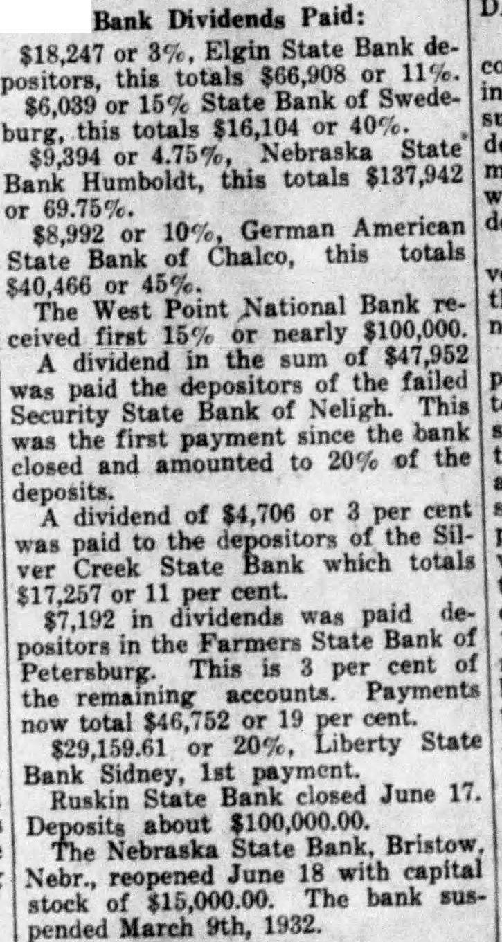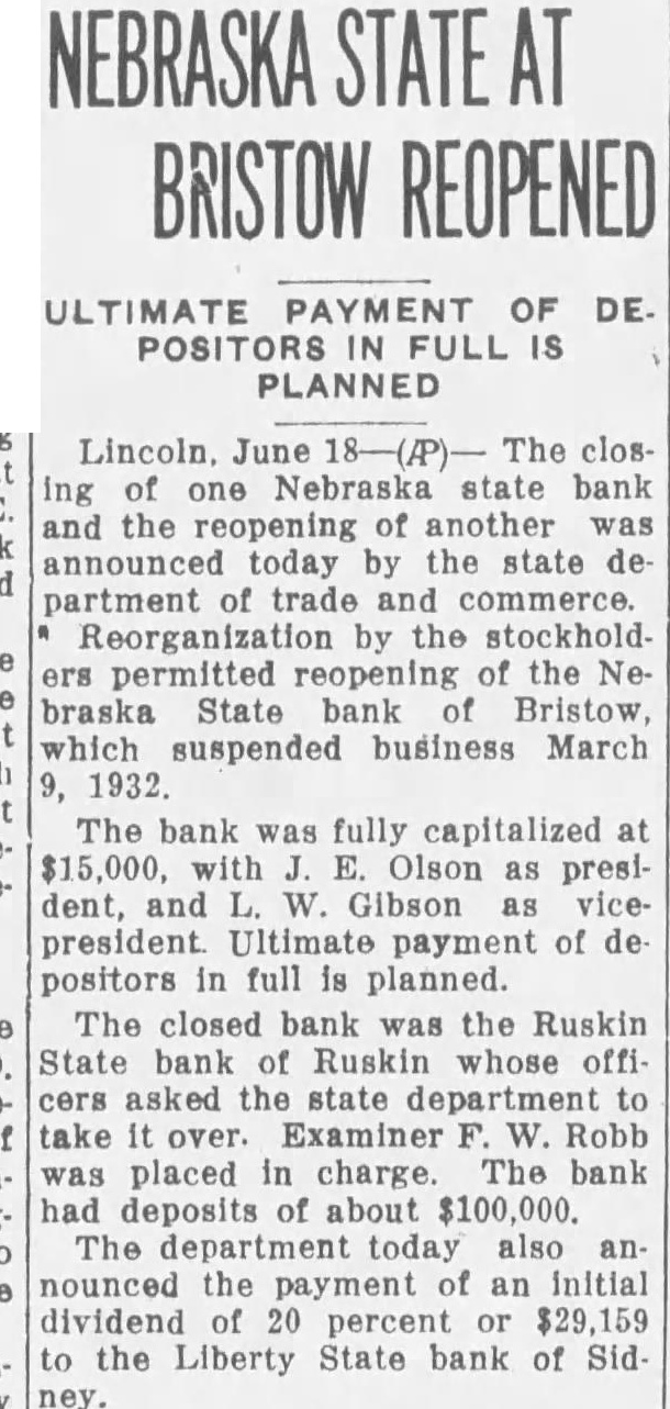 PAYMENT OF POSITORS FULL IS PLANNED Lincoln. June ing of Nebraska state bank and the reopening another announced today the state partment of trade Reorganization the stockholdpermitted reopening the braska State bank of Bristow, which suspended business March The bank fully capitalized with Olson as dent, and Gibson president. Ultimate payment of depositors in full planned. The closed bank the Ruskin State bank Ruskin whose offiasked state department Examiner Robb placed charge. The bank deposits about The today also announced the initial dividend $29,159 the Liberty State bank Sid-