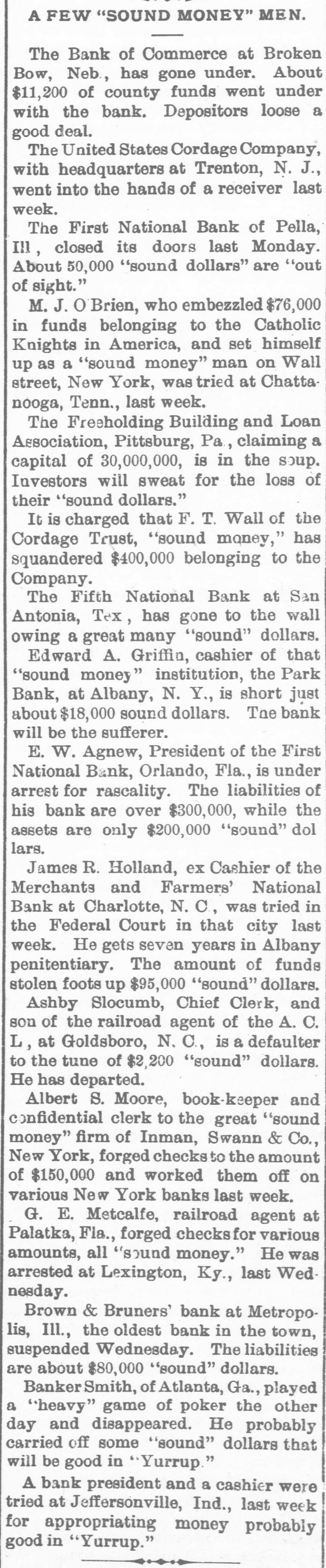 A FEW "SOUND MONEY" MEN. The Bank of Commerce at Broken Bow, Neb, has gone under. About $11,200 of county funds went under with the bank. Depositors loose a good deal. The United States Cordage Company, with headquarters at Trenton, N. J., went into the hands of a receiver last week. The First National Bank of Pella, III, closed its doors last Monday. About 50,000 "sound dollars" are "out of sight." M. J. O Brien, who embezzled $76,000 in funds belonging to the Catholic Knights in America, and set himself up as a "sound money" man on Wall street, New York, was tried at Chattanooga, Tenn., last week. The Freeholding Building and Loan Association, Pittsburg, Pa, claiming a capital of 30,000,000, is in the soup. Investors will sweat for the loss of their "sound dollars." It is charged that F. T. Wall of the Cordage Trust, "sound money," has squandered $400,000 belonging to the Company. The Fifth National Bank at San Antonia, Tex, has gone to the wall owing a great many "sound" dollars. Edward A. Griffin, cashier of that "sound money" institution, the Park Bank, at Albany, N. Y., is short just about $18,000 sound dollars. The bank will be the sufferer. E. W. Agnew, President of the First National Bank, Orlando, Fla., is under arrest for rascality. The liabilities of his bank are over $300,000, while the assets are only $200,000 "sound" dol lars. James R. Holland, ex Cashier of the Merchants and Farmers' National Bank at Charlotte, N. C, was tried in the Federal Court in that city last week. He gets seven years in Albany penitentiary. The amount of funds stolen foots up $95,000 "sound" dollars. Ashby Slocumb, Chief Clerk, and son of the railroad agent of the A. C. L, at Goldsboro, N. C., is a defaulter to the tune of $2,200 "sound" dollars. He has departed. Albert S. Moore, book-keeper and confidential clerk to the great "sound money" firm of Inman, Swann & Co., New York, forged checks to the amount of $150,000 and worked them off on various New York banks last week. G. E. Metcalfe, railroad agent at Palatka, Fla., forged checks for various amounts, all "sound money." He was arrested at Lexington, Ky., last Wednesday. Brown & Bruners' bank at Metropolis, Ill., the oldest bank in the town, suspended Wednesday. The liabilities are about $80,000 "sound" dollars. Banker Smith, of Atlanta, Ga., played a "heavy" game of poker the other day and disappeared. He probably carried off some "sound" dollars that will be good in "Yurrup." A bank president and a cashier were tried at Jeffersonville, Ind., last week for appropriating money probably good in "Yurrup."