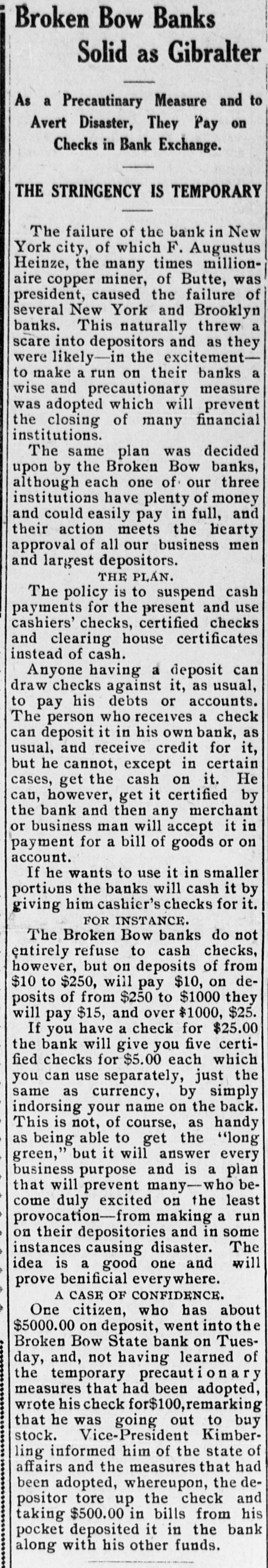 Broken Bow Banks Solid as Gibralter As a Precautinary Measure and to Avert Disaster, They Pay on Checks in Bank Exchange. THE STRINGENCY IS TEMPORARY The failure of the bank in New York city, of which F. Augustus Heinze, the many times millionaire copper miner, of Butte, was president, caused the failure of several New York and Brooklyn banks. This naturally threw a scare into depositors and as they were likely-in the excitementto make a run on their banks a wise and precautionary measure was adopted which will prevent the closing of many financial institutions. The same plan was decided upon by the Broken Bow banks, although each one of our three institutions have plenty of money and could easily pay in full, and their action meets the hearty approval of all our business men and largest depositors. THE PLÁN. The policy is to suspend cash payments for the present and use cashiers' checks, certified checks and clearing house certificates instead of cash. Anyone having a deposit can draw checks against it, as usual, to pay his debts or accounts. The person who receives a check can deposit it in his own bank, as usual, and receive credit for it, but he cannot, except in certain cases, get the cash on it. He can, however, get it certified by the bank and then any merchant or business man will accept it in payment for a bill of goods or on account. If he wants to use it in smaller portions the banks will cash it by giving him cashier's checks for it. FOR INSTANCE. The Broken Bow banks do not entirely refuse to cash checks, however, but on deposits of from $10 to $250, will pay $10, on deposits of from $250 to $1000 they will pay $15, and over $1000, $25. If you have a check for $25.00 the bank will give you five certified checks for $5.00 each which you can use separately, just the same as currency, by simply indorsing your name on the back. This is not, of course, as handy as being able to get the "long green," but it will answer every business purpose and is a plan that will prevent many-who become duly excited on the least provocation-from making a run on their depositories and in some instances causing disaster. The idea is a good one and will prove benificial every where. A CASE OF CONFIDENCE. One citizen, who has about $5000.00 on deposit, went into the Broken Bow State bank on Tuesday, and, not having learned of the temporary precaut a r measures that had been adopted, wrote his check remarking that he was going out to buy stock. Vice-President Kimberling informed him of the state of affairs and the measures that had been adopted, whereupon, the depositor tore up the check and taking $500.00 in bills from his