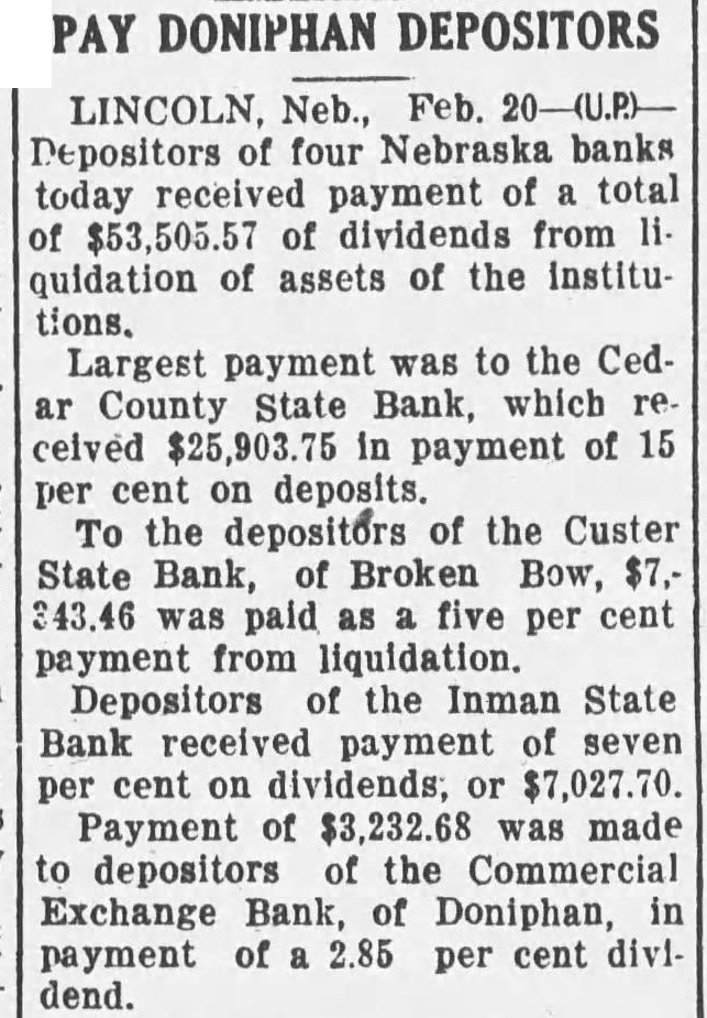 HIGHEST Depositors Committee Buy Assets Of Mason City Bank. Custer State Assets Not in Demand. The of the assets of the Farmer's Bank Mason Custer State Bank Broken Bow, held the courthouse in this city Tuesday, attracted quite people. Most there through curiosity and bidders. charge two representatives state department, McGrew former banker being here at that time. There tremendous differapparently in the and securities these Mason bank totalabout $85,000 were cold Depositor's committee $40.000. assets the Custer State Bank amounted trifle over and brought the insignifisum Haley Investment Company Lexington put the high $505 the assets of the Custer State Bank and this firm was declared the subject, to the sale being confirmed the district court The assets the Custer State Bank over eighty notes and judgements, these ranged in from $9,500 down $7.70. There notes and against seven peomore than $5000 others had notes rangfrom Bids were first individual of $21 was put $3000 group notes and bids of each single One man bid $11 on note representing considerable sum, another large proportions only to of After these several notes and judgements were offered singly and in groups, the entire lot, cluding all the notes and all the judgements the Custer State Bank totaling more than one hundred thousand dollars was offered Nebrasfirm for $505. When the assets of the Farmers Bank offered. once apparent that better conditions existed the Mason City institution. An opportunity first given indinotes and the estate and furniture and fixtures of the bank were offered. The bids these small but the entire assets the bank ing over Mason City, representing depositor's started out bid $30,000. This sum raised three times, and the assets finally sold depositor's committee for $40,000. When the sale confirmed the court, all the assets due course time the bank will receive proportionate share the committee the Mason City bank consists John and Harry Sennett expected that charge bank for many will placed charge settlement the affairs. Redmond the confidence his munity this most excellent way which settle the bank the lowest