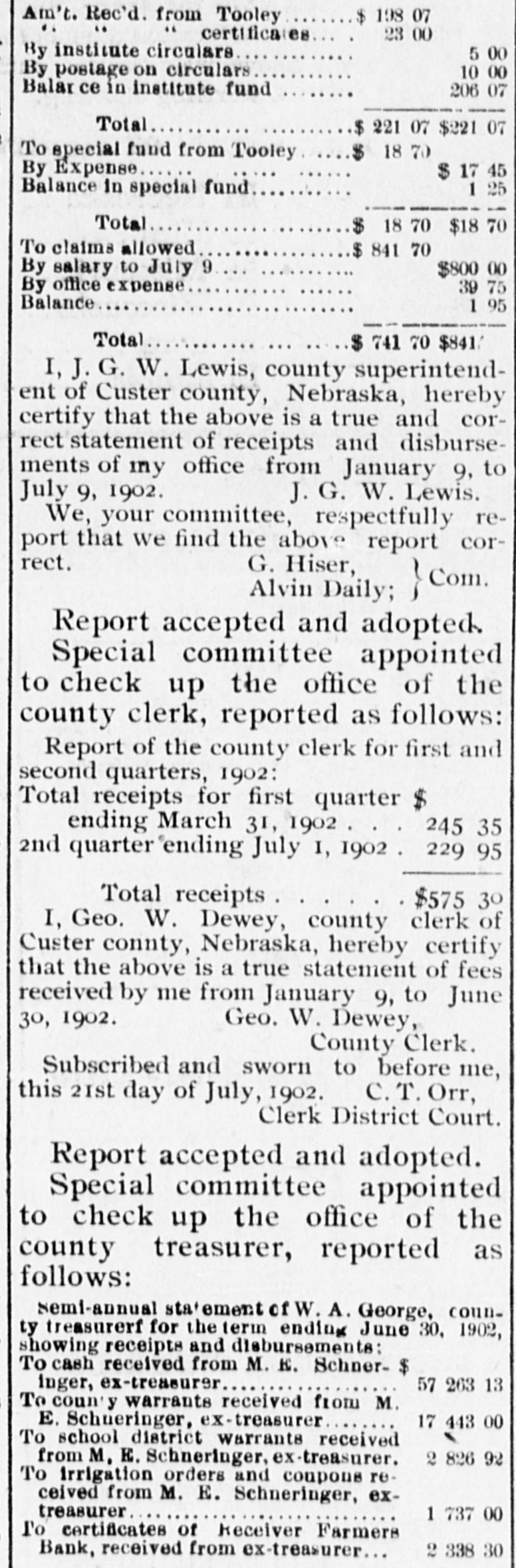 198 07 Am't. Rec'd. from Tooley " 23 00 certificates By institute circulars 5 00 By postage on circulars 10 00 Balar ce in institute fund 206 07 Total $ 221 07 $221 07 $ 18 70 To special fund from Tooley By Expense $ 17 45 1 25 Balance In special fund Total $ 18 70 $18 70 To claims allowed $ 841 70 By salary to July 9 $800 00 By office expense 39 75 Balance 1 95 Total $ 741 70 $841 I, J. G. W. Lewis, county superintendent of Custer county, Nebraska, hereby certify that the above is a true and correct statement of receipts and disbursements of my office from January 9, to July 9, 1902. J. G. W. Lewis. We, your committee, respectfully report that we find the above report correct. G. Hiser, Com. Alvin Daily; Report accepted and adopted. Special committee appointed to check up the office of the county clerk, reported as follows: Report of the county clerk for first and second quarters, 1902: Total receipts for first quarter $ ending March 31, 1902 245 35 229 95 2nd quarter "ending July I, 1902 Total receipts $575 30 I, Geo. W. Dewey, county clerk of Custer county, Nebraska, hereby certify that the above is a true statement of fees received by me from January 9, to June 30, 1902. Geo. W. Dewey, County Clerk. Subscribed and sworn to before me, this 21st day of July, 1902. C. T. Orr, Clerk District Court. Report accepted and adopted. Special committee appointed to check up the office of the county treasurer, reported as follows: semi-annual statement of W. A. George, county treasurerf for the term ending June 30, 1902, showing receipts and disbursements: To cash received from M. K. Schner- $ inger, ex-treasurer 57 263 13 To county warrants received from M. E. Schueringer, ex-treasurer 1744300 To school district Warrants received 2 826 92 from M. E. Schneringer, ex-treasurer. To Irrigation orders and coupons received from M. E. Schneringer, extreasurer 1 737 00 l'o certificates of Receiver Farmers 2 338 30 Bank, received from ex-treasurer
