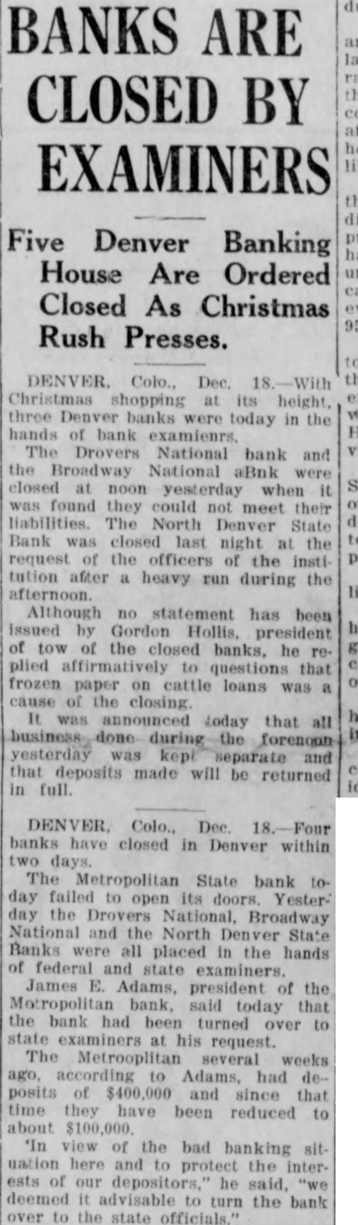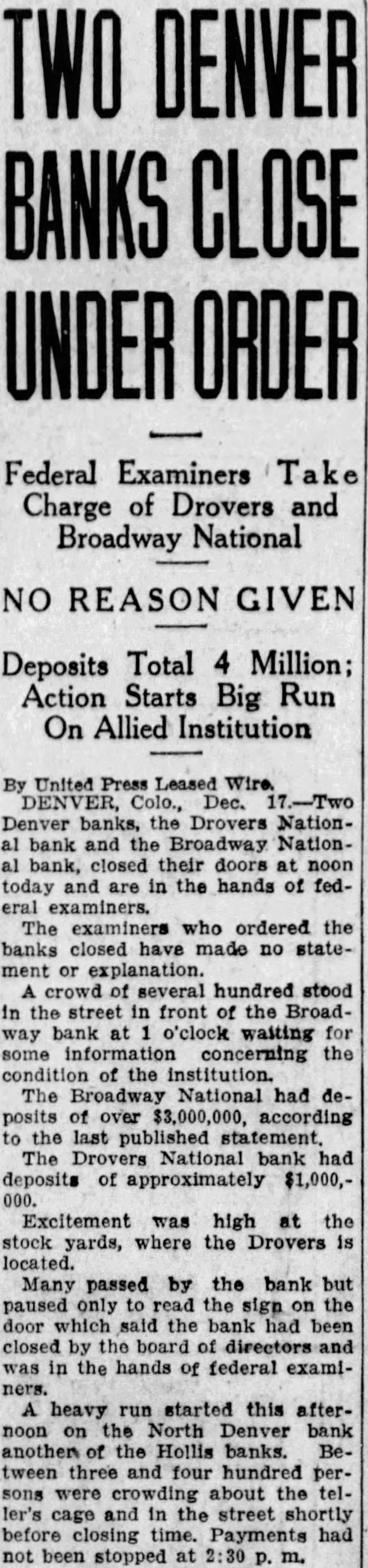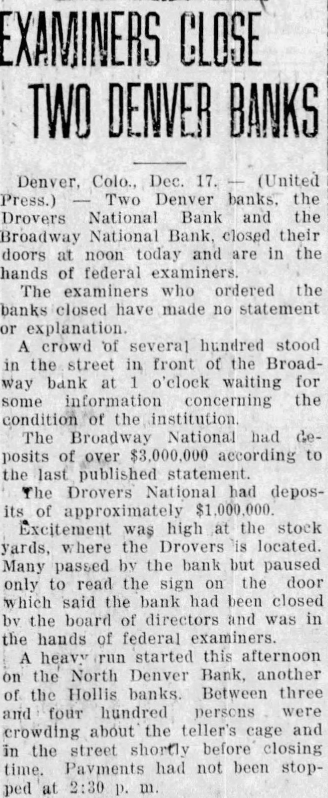 EXAMINERS CLOSE TWO BANKS Denver, Dec. 17. (United Press.) Two Denver banks. the Drovers National Bank and the Broadway National Bank, closed their doors at noon today and are in the hands of federal The examiners who ordered the banks closed have made no statement or crowd of several hundred stood in the street in front of the Broadway bank at o'clock waiting for some information concerning the the institution The Broadway National had deposits of over $3,000,000 according to the published statement. The Drovers had deposits approximately Excitement was high the stock yards, where the Drovers located. Many passed by the bank but paused only to read the sign on the door which said the bank had been closed by the board of directors and was in the hands of federal examiners. heavy run started this afternoon on the North Denver Bank, another of the Hollis banks. Between three and four hundred persons were crowding about the teller's cage and in the street shortly before closing time. Payments had not been stopped
