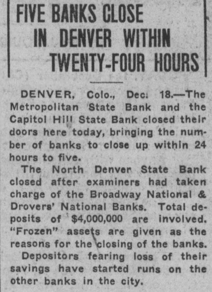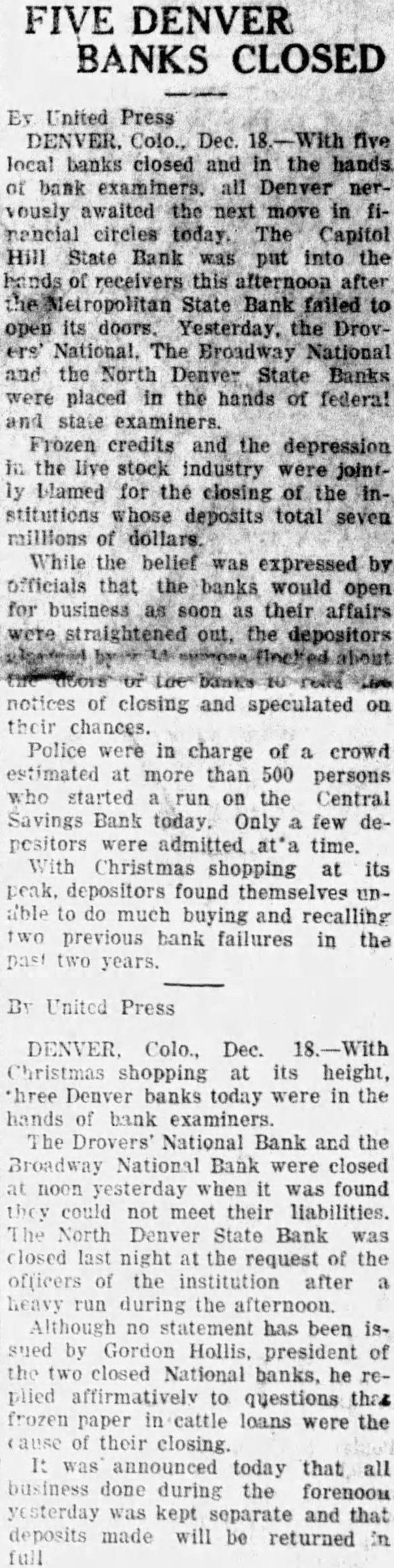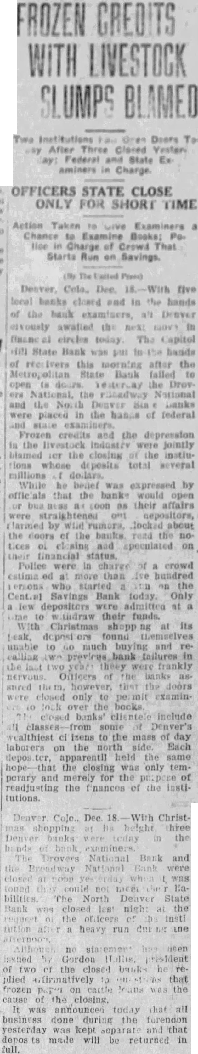 EXAMINERS CLOSE TWO BANKS Denver, Dec. 17. (United Press.) Two Denver banks. the Drovers National Bank and the Broadway National Bank, closed their doors at noon today and are in the hands of federal The examiners who ordered the banks closed have made no statement or crowd of several hundred stood in the street in front of the Broadway bank at o'clock waiting for some information concerning the the institution The Broadway National had deposits of over $3,000,000 according to the published statement. The Drovers had deposits approximately Excitement was high the stock yards, where the Drovers located. Many passed by the bank but paused only to read the sign on the door which said the bank had been closed by the board of directors and was in the hands of federal examiners. heavy run started this afternoon on the North Denver Bank, another of the Hollis banks. Between three and four hundred persons were crowding about the teller's cage and in the street shortly before closing time. Payments had not been stopped