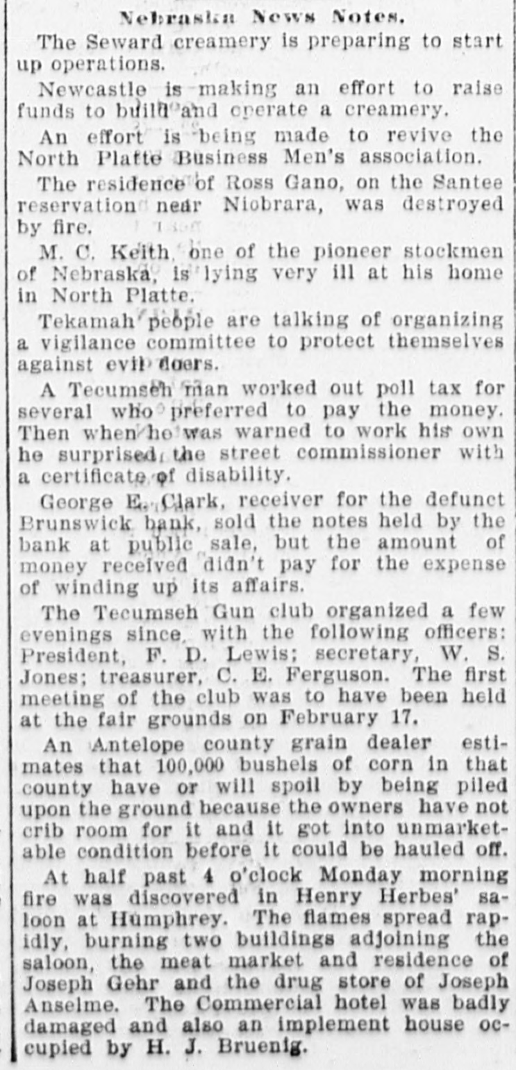 Nebraska News Notes. The Seward creamery is preparing to start up operations. Newcastle is making an effort to raise funds to build and operate a creamery. An effort is being made to revive the North Platte Business Men's association. The residence of Ross Gano, on the Santee reservation near Niobrara, was destroyed by fire. M. C. Keith, one of the pioneer stockmen of Nebraska, is lying very ill at his home in North Platte. Tekamah people are talking of organizing a vigilance committee to protect themselves against evil doers. A Tecumsen man worked out poll tax for several who preferred to pay the money. Then when he was warned to work his own he surprised the street commissioner with a certificate of disability. George E Clark, receiver for the defunct Brunswick bank, sold the notes held by the bank at public sale, but the amount of money received didn't pay for the expense of winding up its affairs. The Tecumseh Gun club organized a few evenings since, with the following officers: President, F. D. Lewis; secretary, W. S. Jones; treasurer, C. E. Ferguson. The first meeting of the club was to have been held at the fair grounds on February 17. An Antelope county grain dealer estimates that 100,000 bushels of corn in that county have or will spoil by being piled upon the ground because the owners have not crib room for it and it got into unmarketable condition before it could be hauled off. At half past 4 o'clock Monday morning fire was discovered in Henry Herbes' saloon at Humphrey. The flames spread rapidly, burning two buildings adjoining the saloon, the meat market and residence of Joseph Gehr and the drug store of Joseph Anselme. The Commercial hotel was badly damaged and also an implement house occupied by H. J. Bruenig.