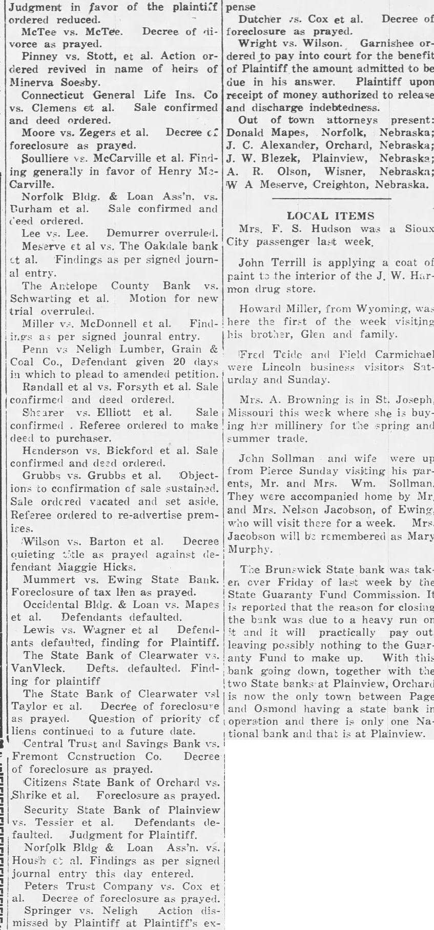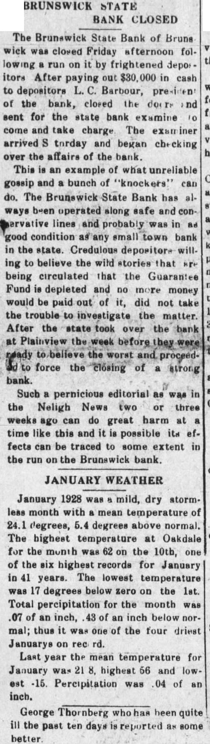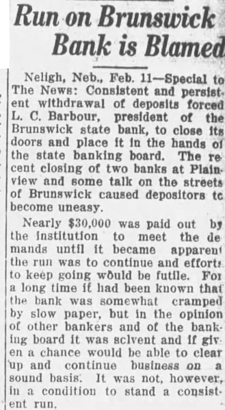 The Brunswick State bank was taken over Friday of last week by the State Guaranty Fund Commission. It is reported that the reason for closing the bank was due to a heavy run on it and it will practically pay out, leaving possibly nothing to the Guaranty Fund to make up. With this bank going down, together with the two State banks at Plainview, Orchard is now the only town between Page and Osmond having a state bank in operation and there is only one National bank and that is at Plainview.