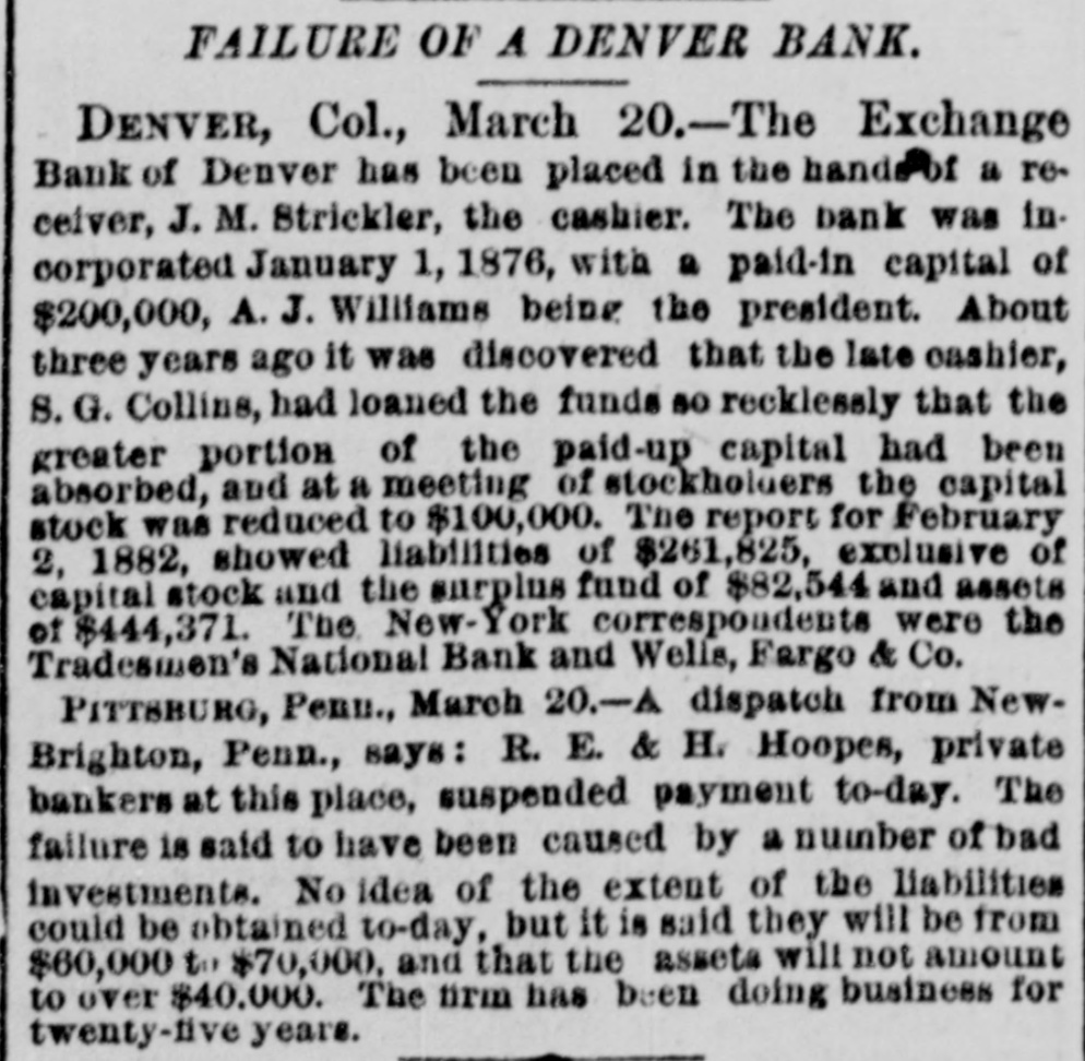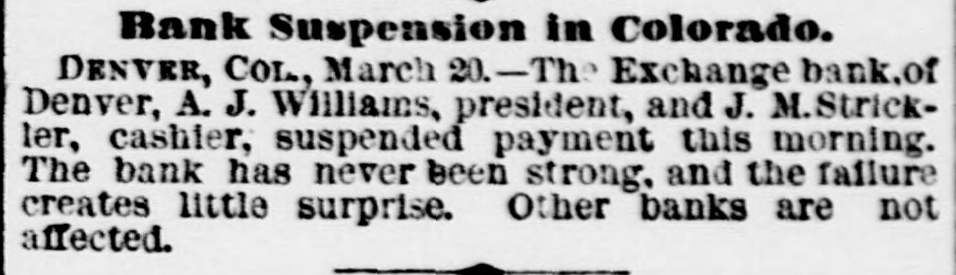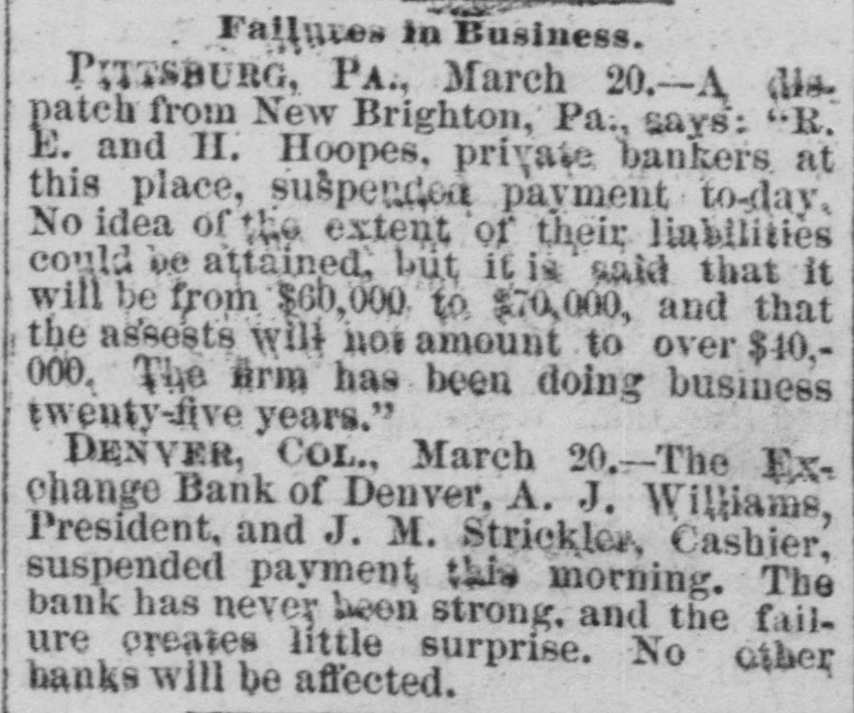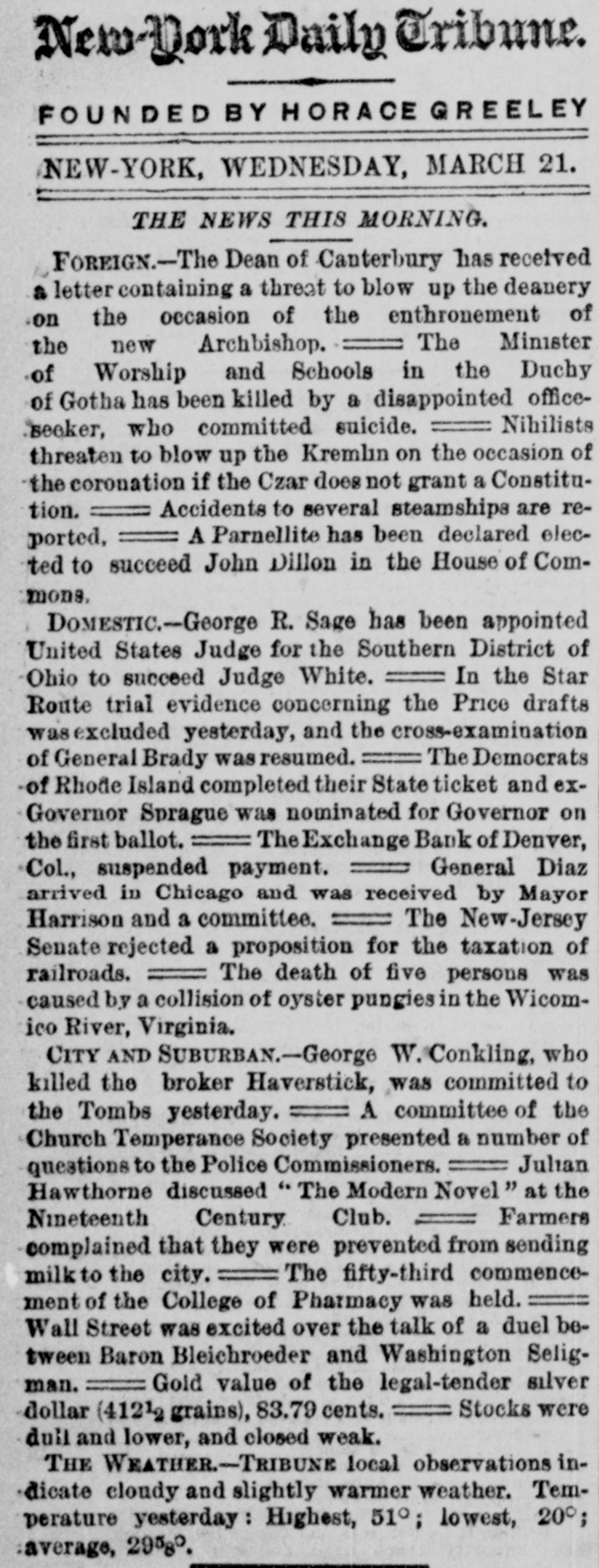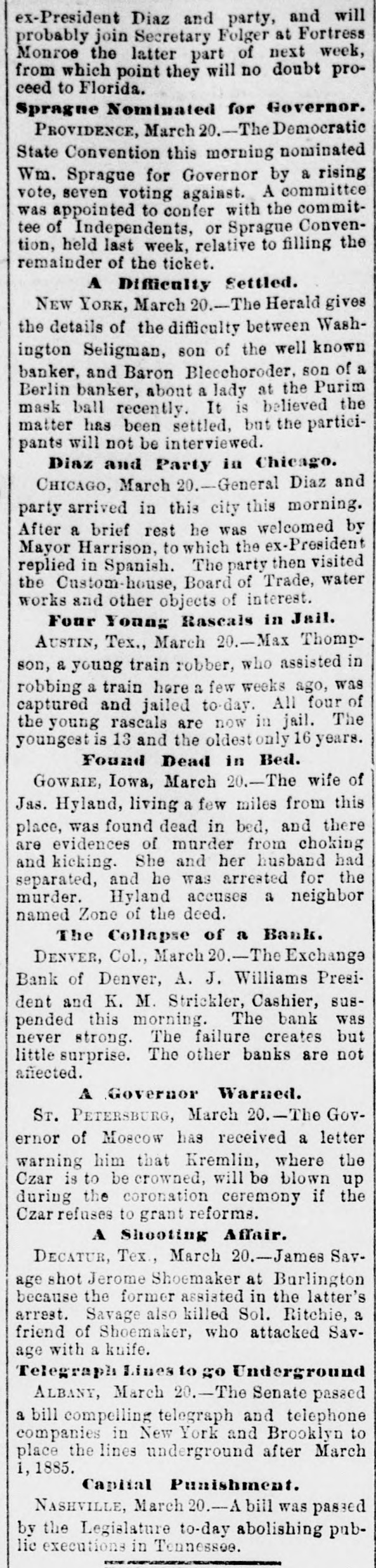 ex-President Diaz and party, and will probably join Secretary Folger at Fortress Monroe the latter part of next week, from which point they will no doubt proceed to Florida. Spragne Nominated for Governor. PROVIDENCE, March 20.-The Democratic State Convention this morning nominated Wm. Sprague for Governor by a rising vote, seven voting against. A committee was appointed to confer with the committee of Independents, or Sprague Convention, held last week, relative to filling the remainder of the ticket. A Difficulty Settled. NEW YORK, March 20.-The Herald gives the details of the difficulty between Washington Seligman, son of the well known banker, and Baron Blecchoroder. son of a Berlin banker, about a lady at the Purim mask ball recently. It is believed the matter has been settled, but the participants will not be interviewed. Diaz and Party in Chicago. CHICAGO, March 20.-General Diaz and party arrived in this city this morning. After a brief rest he was welcomed by Mayor Harrison, to which the ex-President replied in Spanish. The party then visited the Custom-house, Board of Trade, water works and other objects of interest. Four Yonag Rascals in Jail. AUSTIN, Tex., March 20.-Max Thompson, a young train robber, who assisted in robbing a train here a few weeks ago, was captured and jailed today. All four of the young rascals are now in jail. The youngest is 13 and the oldest only 16 years. Found Dead in Bed. GOWRIE, Iowa, March 20.-The wife of Jas. Hyland, living a few miles from this place, was found dead in bed, and there are evidences of murder from choking and kicking. She and her husband had separated, and he was arrested for the murder. Hyland accuses a neighbor named Zone of the deed. The Collapse of a Bank. DENVER, Col., March 20.-The Exchange Bank of Denver, A. J. Williams President and K. M. Strickler, Cashier, suspended this morning. The bank was never strong. The failure creates but little surprise. The other banks are not affected. A Governor Warned. ST. PETERSBURG, March 20.-The Governor of Moscow has received a letter warning him that Kremlin, where the Czar is to be crowned, will be blown up during the coronation ceremony if the Czar refuses to grant reforms. A Shooting Affair. DECATUR, Tex., March 20.-James Savage shot Jerome Shoemaker at Burlington because the former assisted in the latter's arrest. Savage also killed Sol. Ritchie, a friend of Shoemaker, who attacked Savage with a knife. Telegraph Lines to go Underground ALBANY, March 20.-The Senate passed a bill compelling telegraph and telephone companies in New York and Brooklyn to place the lines underground after March i, 1885. Capital Punishment. NASHVILLE, March 20.-A bill was passed by the Legislature to-day abolishing publie executions in Tennessee.
