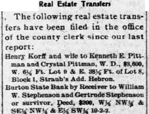 Real Estate Transfers The following real estate transfers have been filed in the office of the county clerk since our last report: Henry Korff and wife to Kenneth E. Pitt. man and Crystal Pittman, W. D., $3,600, W. 61/2 Ft. Lot 9 & E. 38½ Ft. of Lot 8, Block 1, Straub's Add. Hebron. Burton State Bank by Receiver to William W. Stephenson and Gertrude Stephenson or survivor, Deed, $200, W½ & SEX NW4 & E½ SW% 10-2-2.