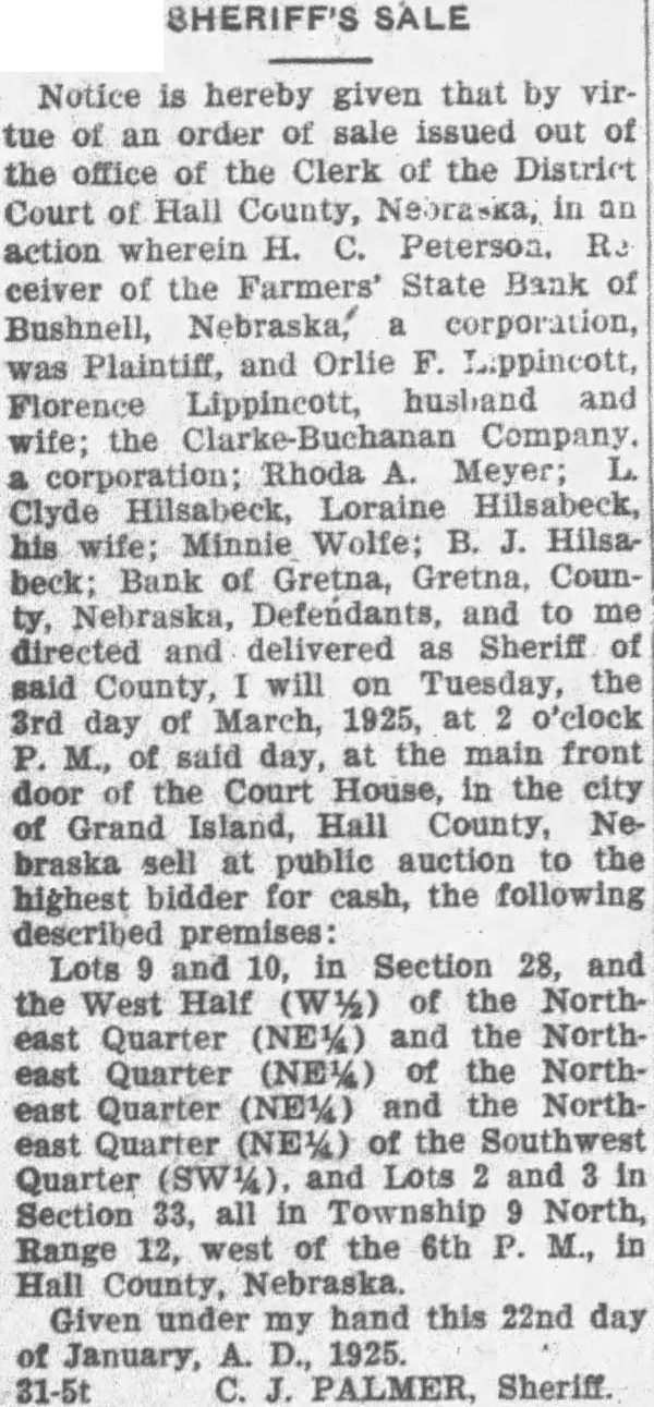 SHERIFF'S SALE Notice is hereby given that by virtue of an order sale issued out of the office of the Clerk of the District Court of Hall County, in an action wherein H. Peterson. Re ceiver of the Farmers' State Bank of Bushnell, Nebraska, corporation, was Plaintiff, and Orlie F. Lappincott, Florence Lippincott, husband and wife; the Company. corporation; Rhoda Meyer; Hilsabeck, Loraine Hilsabeck, Clyde his wife; Minnie Wolfe; B. Hilsabeck; Bank of Gretna, Gretna, CounNebraska, Defendants, and to me directed and delivered Sheriff of said County, will Tuesday, the 3rd day of March, 1925, at o'clock of said day, at the main front door of the Court House, the city of Grand Island, Hall County, braska sell at public auction to the highest bidder for cash, the following described premises: Lots and in Section 28, and the West Half (W½) of the Northeast Quarter (NE%) and the Northeast Quarter (NE%) of the Northeast Quarter (NE%) and the Northeast Quarter (NE%) of the Quarter (SW¹), and Lots and Section 33, all in Township North, Range 12, west of the 6th M., Hall County, Nebraska. Given under my hand this 22nd day January, 1925. 31-5t PALMER, Sheriff.