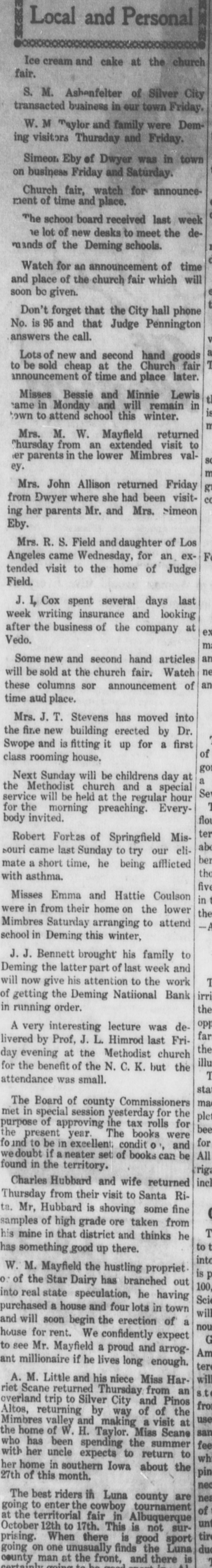 THE LOOTED BANKS. The United States Grand Jury Makes Some Startling Disclosures In Reference to the Rotten Management of the Banks. To of the Hon. John R. McFie, Associate Justice New the Supreme Court of the territory of Mexico, and presiding judge of the third judicial district court thereof. Your grand jurors impaneled and sworn to inquire into violations of the laws of the United States within this judicial district, beg leave to report that we have performed the duty assigned the. Our session has been long and arduous owing to the full investigation we have given the na. tional bank cases originating in Grant county With the exception of the matters growing out of those cases there have been but few viola tiens of the laws of the United States brought to our knowledge which warranted a present ment by indictment. The greater part of thee have been violations of what is known as the Edmonds Act, and the decrease in the number of cases of this character indicates that the vigorous enforcement of this law has had beneficial triot. effect upon the morals of this dis The greater portion of our time has been 00 enpied with the investigation of the bank cases. and during this investigation facts of B startling and extraordinary R character have been disclosed that we deem it our duty t the public to inform them through this repor of the true condition of the affairs of thes banks, and to place the blame where it prop erly belongs. From the evidence elicited before no it ap pears that there were two national banks d Grant county under substantially the sam of management, one at Deming with capits stock of $100,000. and "another at Silver Cit with R capital stock of $50,000. Mr. Charles H. Dane was president of bot these banks. and appears to have been the or clusive manager of the affairs of both of them d It is true that both banks had boards of direc tore, but it appears that the extent of their it terference or supervision of the concerns r the banks was to certify and approve as correo all that was done by Mr. Dane. By reason 18 the criminal negligence of these boards directors, the president of the banks was er d abled to abstract and apply to his own use th S. funds of the banks amou ting to nearly th entire capital stock of both banks. The dire tors of these banks are technically guilty of th to same offences for which Mr. Dane has bee n presented by no, but the government has no 18 seen proper for reasons of its own to prosecut them. Had their cases been submitted to IS we should certainly have presented them. at well as the cashiers of both banks. who bot had a guilty knowledge of Mr. Dane's doing d although it does not sppear that either of the profited by the same. If any of the directors of the Deming ban had made the elightest examination into i or affairs he could not have failed to discover the in Mr. Dane was using the resources of the ban to for his own private purposes. y For example: Mr. Dane borrowed from ti or or bank on his own unsecured notes, $10,000;) then borrowed from the bank $6,000 on an un in secured note signed by The Oak Grove and 8 of erra Verde Cattle company, per O. H. Dar is Treasurer, and $4709 on a note signed Hor Shoe Land and Cattle company, C. H. Dan in President, and $6,000 on a note signed TI a Vermino Company, C. H. Dane. President, an $700 on a note signed Deming Pipe Line Con pany, and $3700 on a note signed The Vermi ot Company, by C. H. Dane, President. to On the above notes Mr. Dane obtained fro pthe bank $43,000. He also obtained on tv D' notes signed by J. C. Murnock, a clerk, $10.20 and on a note signed Ralph W. Mead $2,152.0 z. and on a note signed Indian Springs Catt Comp Frank H. Siebold, secretary. $10.00 M- Siebold was cashier of the Deming bar and not only put the last mentioned note in tl cbank to enable Mr. Dane to take out this to be thousand dollars, but also but in another no p. signed by Pearl H. Biebold, his wife. for $5.00 88 None of this fifteen thousand dollars went ed Mr. Siebold or his wife, but they allowed the is names to be used by Mr. Dane to take t slement. money and are technically parties to its embe liThe same may be said of two notes for : signed by Murat Masterson, and one for $5.00 he and one note for $4,800, *igned by W. Berg, a in one note for $9,000, signed by James Koc in Frank Siebold, attorney; and one note f & $4,900, signed by Louis Altman: and one no he for $4,000, signed by Christ Feller: and one no for $9,107.70, signed by M. E. Dane, and t ist notes for $5,000 each, signed by M. L. C. Dar 8" wife of C, H. Dane. he There was also an overdraft by Mr. Dane nd about $21,000, in all aggregating $186,000, whi he was taken from the funds of the Deming ba by Mr. Dane and applied to his own use, de All of this could at any time have been d he covered by the directors had they given a for attention to the affairs of the bank: the dire to tors would certainly have known that the P 8, sons whose names were signed to those une cured notes were utterly irresponsible and th no could not have failed to have understood the S the names were simply used as a cloak und ry. which Mr. Dane was appropriating the funds arthe bank. In order to cover up the conditi ed of the bank's abairs. false reports were made the Comptrolier of the currency and publish is in the newspapers. These reports were tested as correct wefind attached to them my certifying their correctness the names of o or tain directors of the bank. Mr. J. P. McGror orER John Corbett, Henry Chase and Mr Folsom, a my although it appears that none of these gent to men profited in any way by the doings of B to Dane, yet we have no doubt that they, inste of examining into these reports and ascertai ER ing whether or not they were correct. took t VE word of Mr. Dane as to the correctness, and OR certified to them. These reports were false every instance, and we believe these directo to to to have been guilty of Julpable negligence a uly meriting the most overe cens