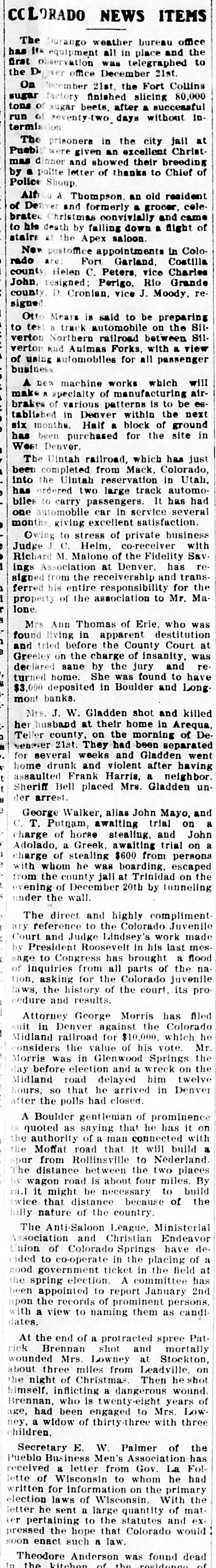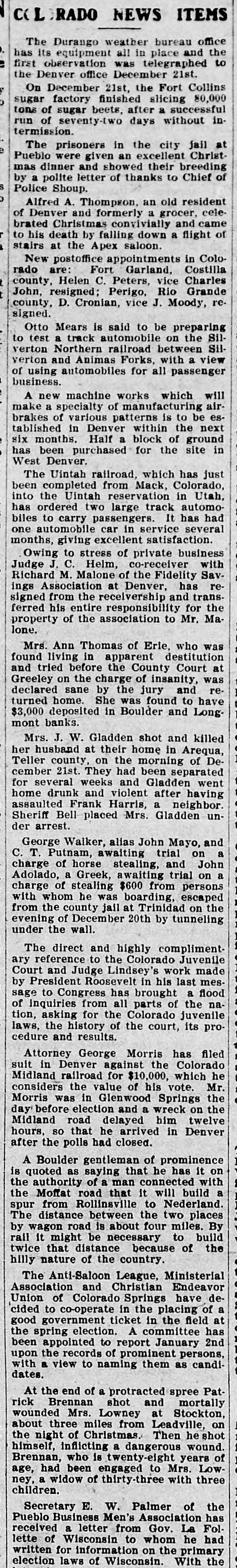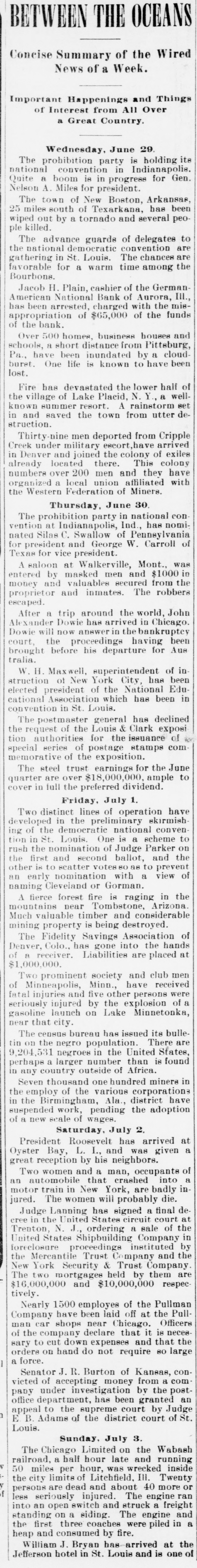 OCEANS Concise Summary of the Wired News of a Week. Important Happenings and Things of Interest from All Over a Great Country. Wednesday, June 29 The prohibition party is holding national convention in Indianapolie. Gen. Quite a boom is in progress for Nelson A. Miles for president. The town of New Boston, Arkansae 25 miles south of Texarkana, has been wiped out by a tornado and several people killed. The advance guards of delegates to the national democratic convention are gathering in St. Louis. The chances favorable for a warm time among the Bourbons. Jacob H. Plain, cashier of the GermanAmerican National Bank of Aurora, III., has been arrested, charged with the misappropriation of $65,000 of the funds of the bank. Over 500 homes, business houses and schools, A short distance from Pittsburg, Pa., have been inundated by a cloud buret. One life is known to have been lost. Fire has devastated the lower half of the village of Lake Placid, N. Y., a wellknown summer resort. A rainstorm set dein and saved the town from utter struction. Thirty-nine men deported from Cripple Creek under military escort,have arrived in Denver and joined the colony of exiles already located there. This colony numbers over 200 men and they have organized a local union affiliated with the Western Federation of Miners. Thursday. June 30. The prohibition party in national con vention at Indianapolis, Ind. has nominated Silas C. Swallow of Penneylvania for president and George W. Carroll of Texas for vice president. A ealoon at Walkerville, Mont., was entered by masked men and $1000 i money and valuables secured from the proprietor and inmates. The robbers escaped. After a trip around the world, John Alexander Dowie has arrived in Chicago. Dowie will now answerin the bankruptcy court, the proceedings having been brought before his departure for Aue tralia. W.H. Maxwell, euperintendent of in atruction of New York City, has been elected president of the National Educational Association which has been in convention in St. Louis. The postmaster general has declined the request of the Louis & Clark exposi tion authorities for the issuance of special series of postage stamps com memorative of the exposition. The steel trust earnings for the June to quarter are over $18,000,000. ample cover in full the preferred dividend. Friday, July 1. Two distinct lines of operation have developed in the preliminary ekirmish ing of the democratic national convention in St. Louis. One is a scheme to rush the nomination of Judge Parker on the first and second ballot, and the other is to scatter votes 80 as to prevent of an early nomination with a view naming Cleveland or Gorman. A fierce forest fire is raging in the mountains near Tombstone, Arizona Much valuable timber and considerable mining property is being destroyed. The Fidelity Savings Association of Denver, Colo., has gone into the hands of receiver. Liabilities are placed at $1,000,000. Two prominent society and club men Minneapolis, Minn., have received fatal of injuries and five other persone were seriously injured by the explosion of gasoline launch on Lake Minnetonka, near that city. The census bureau has issued its bulletin on the negro population. There are 9,204,531 negroes in the United States, found perhaps a larger number than is in any country outside of Africa. Seven thousand one hundred minere in the employ of the various corporations have the Birmingham Ala., district in suspended work, pending the adoption of a new scale of wages. Saturday. July 2. President Roosevelt has arrived at a Oyster Bay, L. I., and was given great reception by his neighbors. Two women and a man, occupants of a automobile that crashed into an motor train in New York, are badly in jured. The women will probably die. Judge Lanning has signed a final de in the United States circuit court at cree Trenton, N. J., ordering a sale of the in United States Shipbuilding Company by foreclosure proceedings instituted the the Mercantile Trust Company and New York Security & Trust Company The two mortgages held by them are $16,000,000 and $10,000,000 respectively. Nearly 1500 employes of the Pullman Company have been laid off at the Officers Pull car shops near Chicago. of man the company declare that it is neces the to cut down expenses and that sary orders on hand do not require 80 large force. Senator J. R. Burton of Kaneas, convicted of accepting money from a com under investigation by the postpany office department, has been granted an appeal to the supreme court by Judge of St. E B. Adams of the district court Louis. Sunday. July 3. The Chicago Limited on the Wabash railroad, a half hour late and running miles per hour, was wrecked inside 50 limits of Litchfield. Ill. Twenty f the city are dead and about 40 more or less persons seriously injured. The engine ran into an open switch and struck a freight and standing on a eiding. The engine the first three coaches were piled in a heap and consumed by fire. William J. Bryan has arrived at the Jefferson hotel in St. Louis and is one of