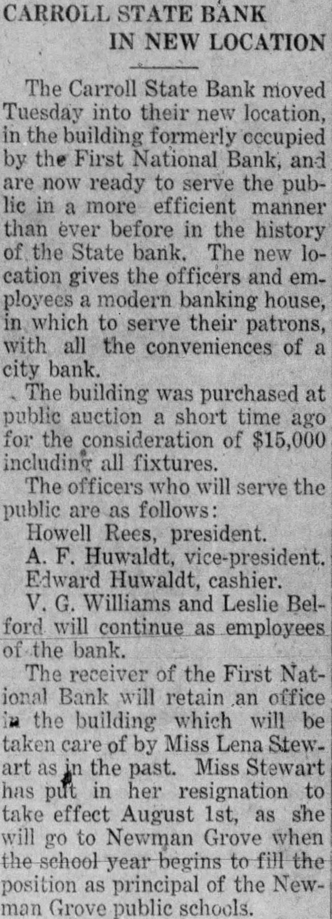 CARROLL STATE BANK IN NEW LOCATION The Carroll State Bank moved Tuesday into their new location, in the building formerly occupied by the First National Bank, and are now ready to serve the publie in a more efficient manner than ever before in the history of the State bank. The new location gives the officers and employees a modern banking house, in which to serve their patrons, with all the conveniences of a city bank. The building was purchased at public auction a short time ago for the consideration of $15,000 including all fixtures. The officers who will serve the public are as follows: Howell Rees, president. A. F. Huwaldt, vice-president. Edward Huwaldt, cashier. V. G. Williams and Leslie Belford will continue as employees of the bank. The receiver of the First National Bank will retain an office in the building which will be taken care of by Miss Lena Stewart as in the past. Miss Stewart has put in her resignation to take effect August 1st, as she will go to Newman Grove when the school year begins to fill the position as principal of the Newman Grove public schools.