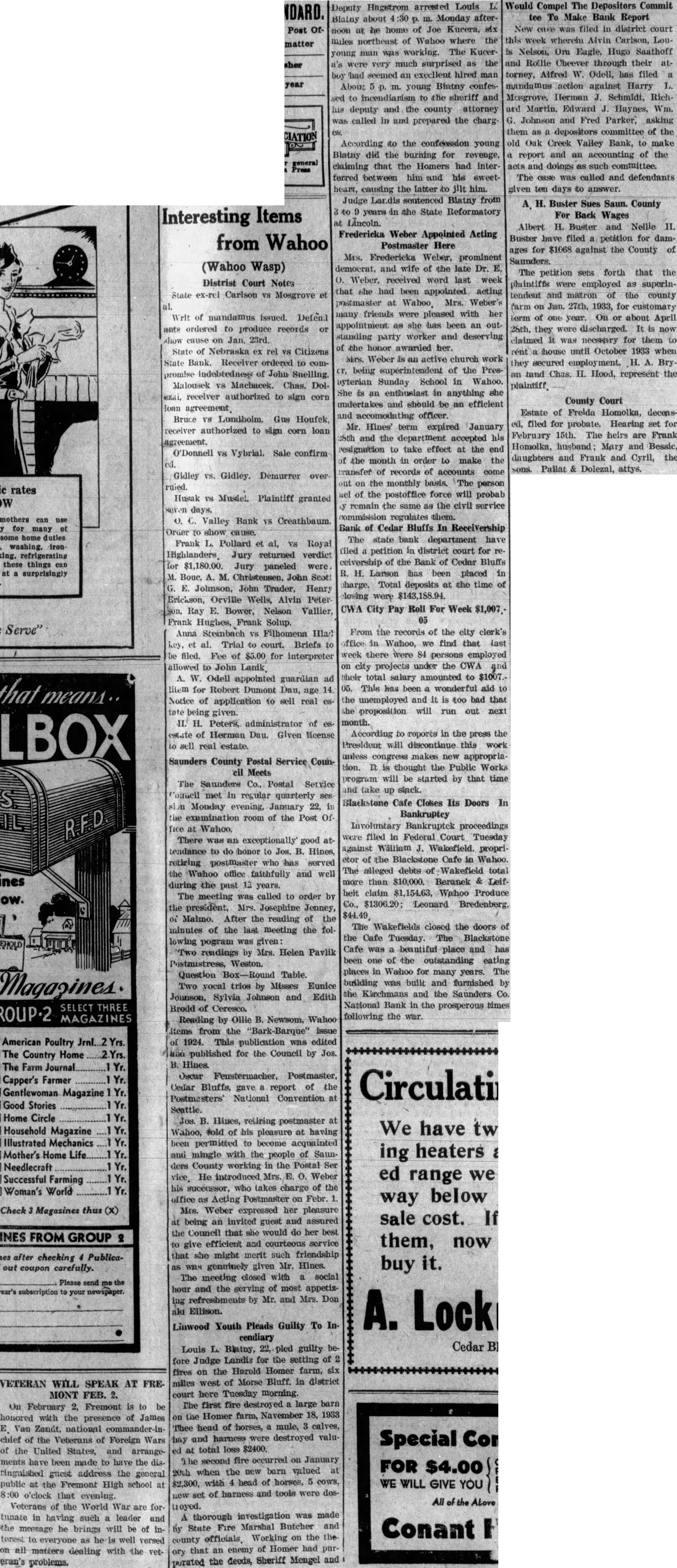 Interesting Items from Wahoo (Wahoo Wasp) Distrist Court Notes State ex-rel Carlson vs Mosgrove et al. Writ of mandamus issued. Defend ants ordered to produce records or show cause on Jan. 23rd. State of Nebraska ex rel vs Citizens State Bank. Receiver ordered to compromise indebtedness of John Snelling. Malousek vs Machacek. Chas. Dolezai, receiver authorized to sign corn loan agreement. Bruce VS Lundholm. Gus Houfek, receiver authorized to sign corn loan agreement. O'Donnell vs Vybrial. Sale confirm od. Gidley vs. Gidley. Demurrer over Husak vs Music!. Plaintiff granted days. O. C. Valley Bank vs Creathbaum. Order to show cause. Frank L. Pollard et al, VS Royal Highlanders. Jury returned verdict all these things can for $1,180.00. Jury paneled were. M. Boue, A. M. Christensen, John Scott G. E. Johnson, John Trader, Henry Erickson, Orville Wells, Alvin Peter son, Ray E. Bower, Nelson Vallier, Frank Hughes, Frank Solup. Anna Steinbach VS Filhomena Had key, et al. Trial to court. Briefs to be filed. Fee of $5.00 for interpreter allowed to John Lanik, A. W. Odell appointed guardian ad litem for Robert Dumont Dau, age 14. Notice of application to sell real estate being given. II. H. Peters, administrator of esestate of Herman Dau. Given license to sell real lestate. Saunders County Postal Service Council Meets The Saunders Co., Postal Service Council met in regular quarterly ses Monday evening, January 22, in the examination room of the Post Of R.F.D. fice at Wahoo. There was an exceptionally good attendance to do honor to Jos. B. Hines, retiring postmaster who has served the Wahoo office faithfully and well during the past 12 years. The meeting was called to order by the president, Mrs. Josephine Jenney, of Malmo. After the reading of the ininutes of the last meeting the fol- lowing pogram was given: "Two readings by Mrs. Helen Pavlik Postmistress, Weston. Question Box-Round Table. Two vocal trios by Misses Eunice Jonnson, Sylvia Johnson and Edith SELECT THREE Brodd of Ceresco. GROUP-2 MAGAZINES Reading by Ollie B. Newsom. Wahoo items from the "Bark-Barque" issue American Poultry Jrnl. Yrs. of 1924. This publication was edited The Country Home 2.Yrs. and published for the Council by Jos. B. Hines. The Farm Journal Yr. Oscur Fenstermacher, Postmaster, Capper's Farmer Yr. Cedar Bluffs, gave a report of the Gentlewoman Magazine Yr. Postmasters' National Convention at Good Stories Yr. Seattle. Home Circle Yr. Jos. B. Hines, retiring postmaster at Household Magazine Yr. Wahoo, told of his pleasure at having Illustrated Mechanics Yr. been permitted to become acquainted Mother's Home Life Yr. and mingle with the people of SaunNeedlecraft Yr. dens County working in the Postal Ser Yr. vice, He introduced Mrs. E. O. Weber Successful Farming his successor, who takes charge of the Woman's World Yr. office as Acting Postmaster on Febr. 1. Check 3 Magazines thus (x) Mrs. Weber expressed her pleasure at being an invited guest and assured the Council that she would do her best to give efficient and courteous service that she might merit such friendship as WILN genninely given Mr. Hines. The meeting closed with a social Please send me the hour and the serving of most appetizing refreshments by Mr. and Mrs. Don ald Ellison. Linwood Youth Pleads Guilty To Incendiary Louis L. Blatny, 22, pled guilty before Judge Landis for the setting of 2 fires on the Harold Homer farm, six miles west of Morse Bluff. in district court here Tuesday morning. The first fire destroyed a large barn on the Homer farm, Navember 18, 1933 Thee head of horses, a mule, 3 calves, hay and harness were destroyed valued at total loss $2400. The second fire occurred on January FOR $4.00 20th when the new barn valued at $2,300, with 4 head of horses, 5 cows, WE WILL GIVE YOU LCW set of harness and tools were desA thorough investigation was made by State Fire Marshal Butcher and county officials. Working on the the ory that an enemy of Homer had purporated the deeds, Sheriff Mengel and Deputy Hagstrom arrested Louis L. Blainy about :30 p. m. Monday afternoon at he home of Joe Kucera, six miles northeast of Wahoo where the young man was working. The Kucera's were very much surprised as the boy had seemed an excellent hired man About 5 p. m. young Blatny confessed to incendiarism to the sheriff and his deputy and the county attorney was called in and prepared the charges. According to the confession young Blatny did the burning for revenge, claiming that the Homers had interferred between him and his sweetheart, causing the latter to jilt him. Judge Lar. sentenced Blatny from 3 to 9 years in the State Reformatory at Lincoln. Fredericka Weber Appointed Acting Postmaster Here Mrs. Fredericka Weber, prominent democrat, and wife of the late Dr. E. 0. Weber, received word last week that she had been appointed acting postmaster at Wahoo. Mrs. Weber's many friends were pleased with her appointment as she has been an outstanding party worker and deserving of the honor awarded her. birs. Weber is an active church work cr, being superintendent of the Presbyterian Sunday School in Wahoo. She is an enthusiast in anything she undertakes and should be an efficient and accomodating officer. Mr. Hines' term expired January :Sth and the department accepted his resignation to take effect at the end of the month in order to make the transfer of records of accounts come out on the monthly basis. The person wel of the postoffice force will probab y remain the same as the civil service commisision regulates them. Bank of Cedar Bluffs In Receivership The state bank department have filed a petition in district court for receivership of the Bank of Cedar Bluffs R. H. Larson has been placed in charge. Total deposits at the time of closing were $143,188.94. CWA City Pay Roll For Week $1,007. 05 From the records of the city clerk's office in Wahoo, we find that last week there were 84 persons employed on city projects under the CWA and their total salary amounted to $1007