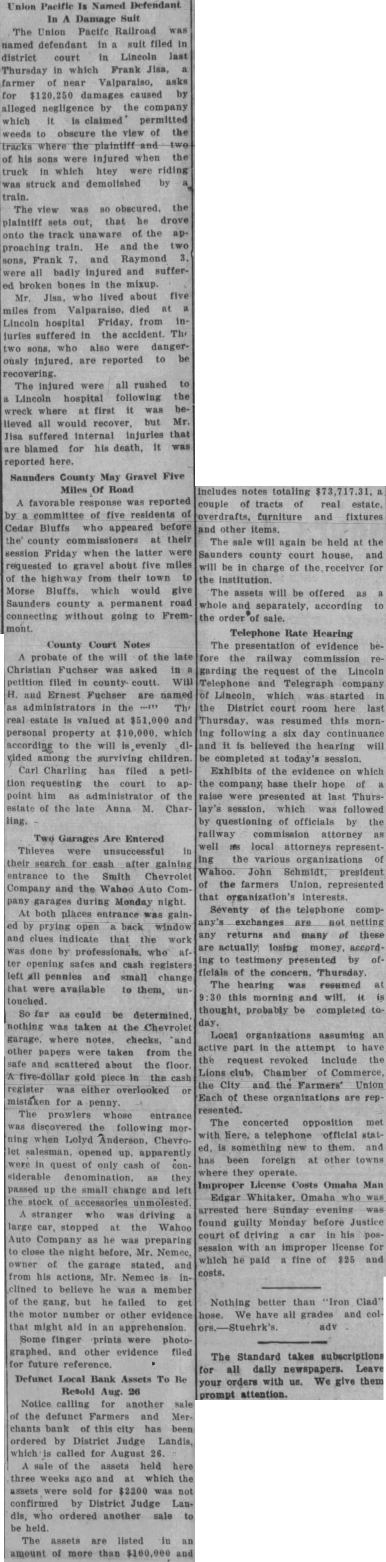 Union Pacific Is Named Defendant In A Damage Suit The Union Pacife Railroad was named defendant in a suit filed in district court in Lineoln last Thursday in which Frank Jisa, a farmer of near Valparaiso, asks for $120,250 damages caused by alleged negligence by the company which It is claimed permitted weeds to obseure the view of the tracks where the plaintiff two of his sons were injured when the truck in which htey were riding was struck and demolished by train. The view was so obscured. the plaintiff sets out, that he drove onto the track unaware of the approaching train. He and the two sons, Frank 7. and Raymond 3, were all badly injured and suffered broken bones in the mixup. Mr. Jisa, who lived about five miles from Valparaiso, died at a Lincoln hospital Friday, from injuries suffered in the accident. The two sons, who also were dangerously injured, are reported to be recovering. The injured were all rushed to a Lincoln hospital following the wreck where at first it was believed all would recover, but Mr. Jisa suffered internal injuries that are blamed for his death, it was reported here. Saunders County May Gravel Five Miles Of Road A favorable response was reported by a committee of five residents of Cedar Bluffs who appeared before the county commissioners at their session Friday when the latter were requested to gravel about five miles of the highway from their town to Morse Bluffs. which would give Saunders county a permanent road connecting without going to Fremmont. County Court Notes A probate of the will of the late Christian Fuchser was asked in petition filed in county coutt. Will H. and Ernest Fuchser are named as administrators in the ----- The real estate is valued at $51,000 and personal property at $10,000. which according to the will is evenly divided among the surviving children. Carl Charling has filed a petition requesting the court to appoint him as administrator of the estate of the late Anna M. Charling. Two Garages Are Entered Thieves were unsuccessful in their search for cash after gaining entrance to the Smith Chevrolet Company and the Wahoo Auto Company garages during Monday night. At both places entrance was gained by prying open a back window and clues indicate that the work was done by professionals. who after opening safes and cash registers left all pennies and small change that were available to them, untouched. So far as could be determined. nothing was taken at the Chevrolet garage, where notes, checks, "and other papers were taken from the safe and scattered about the floor. A five-dollar gold piece in the cash register was either overlooked or mistaken for a penny. The prowlers whose entrance was discovered the following morning when Lolyd Anderson. Chevrolet salesman, opened up. apparently were in quest of only cash of considerable denomination, as they passed up the small change and left the stock of accessories unmolested. A stranger who was driving a large car, stopped at the Wahoo Auto Company as he was preparing to close the night before, Mr. Nemec, owner of the garage stated, and from his actions, Mr. Nemec is inclined to believe he was a member of the gang, but he failed to get the motor number or other evidence that might aid in an apprehension. Some finger prints were photographed. and other evidence filed for future reference. Defunct Local Bank Assets To Be Resold Aug. 26 Notice calling for another sale of the defunct Farmers and Merchants bank of this city has been ordered by District Judge Landis, which is called for August 26. A sale of the assets held here three weeks ago and at which the assets were sold for $2200 was not confirmed by District Judge Landls, who ordered another sale to be held. The assets are listed in an amount of more than $100,000 and includes notes totaling $73,717.31, couple of tracts of real estate. overdrafts, furniture and fixtures and other items. The sale will again be held at the Saunders county court house, and will be in charge of the receiver for the institution. The assets will be offered as a whole and separately, according to the order of sale. Telephone Rate Hearing The presentation of evidence before the railway commission regarding the request of the Lincoln Telephone and Telegraph company of Lincoln, which was started in the District court room here last Thursday, was resumed this morning following a six day continuance and it is believed the hearing will be completed at today's session. Exhibits of the evidence on which the company, base their hope of a raise were presented at last Thurslay's session. which was followed by questioning of officials by the railway commission attorney as well as local attorneys representing the various organizations of Wahoo. John Schmidt, president of the farmers Union, represented that organization's interests. Seventy of the telephone company's exchanges are not netting any returns and many of these are actually losing money, according to testimony presented by officials of the concern, Thursday. The hearing was resumed at 9:30 this morning and will, it is thought, probably be completed today. Local organizations assuming an active part in the attempt to have the request revoked include the Lions club. Chamber of Commerce, the City and the Farmers' Union Each of these organizations are rep resented. The concerted opposition met with here, a telephone official stated, is something new to them. and has been foreign at other towns where they operate. Improper License Costs Omaha Man Edgar Whitaker, Omaha who was arrested here Sunday evening was found guilty Monday before Justice court of driving a car in his possession with an improper license for which he paid a fine of $25 and costs. Nothing better than "Iron Clad" hose. We have all grades and coladv The Standard takes subscriptions for all daily newspapers. Leave your orders with us. We give them prompt attention.