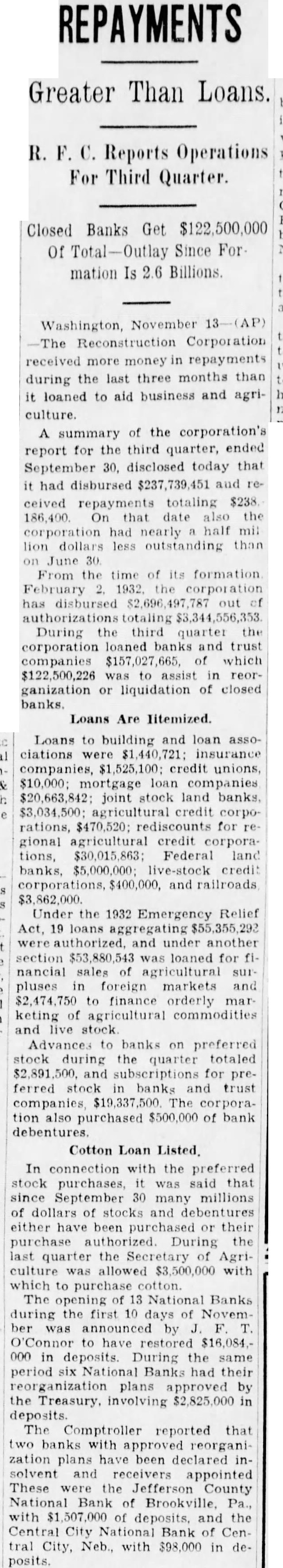 REPAYMENTS Greater Than Loans. R. F. C. Reports Operations For Third Quarter. Closed Banks Get $122,500,000 Of Since For mation 2.6 Billions. Washington, November -The Reconstruction Corporation received more money in repayments during the last three months than it loaned to aid business and agriculture. A summary of the corporation's report for the third quarter, ended September 30, disclosed today that it had disbursed and received repayments totaling $238 186,400 that the corporation had nearly half mil lion dollars less outstanding than June From the time of its formation February the corporation has disbursed authorizations totaling During third quarter the corporation loaned and trust companies of which $122,500,226 reorganization or liquidation of closed banks. Loans Are Iltemized. Loans to building and loan associations insurance companies, $1,525,100 credit unions, $20,663,842 joint stock land banks. corporations, $470,520; rediscounts for gional agricultural credit corporations, $30,015,863; Federal land banks, $5,000,000; credit corporations, $400,000, and railroads Under the 1932 Emergency Relief Act, 19 loans aggregating $55,355,293 authorized and under another section $53,880,543 loaned for financial sales agricultural surpluses foreign markets and to finance orderly keting agricultural commodities and live stock banks on preferred during the quarter totaled and subscriptions for preferred banks companies $19,337,500 The corporation purchased of bank debentures. Cotton Loan Listed. In connection with the stock was said that September 30 many millions of dollars and debentures either have their purchase authorized During the quarter the Secretary of Agriculture allowed $3,500,000 with which purchase The opening National Banks during the first 10 days of Novem announced by D'Connor to have restored $16,084.000 in deposits. During the same period six National Banks had their reorganization plans approved by the Treasury. involving $2,825,000 The reported that with zation have been declared insolvent and appointed These the Jefferson County National Bank of Brookville, Pa., with and the Central City Bank of Central City, Neb., with $98,000 in deposits.