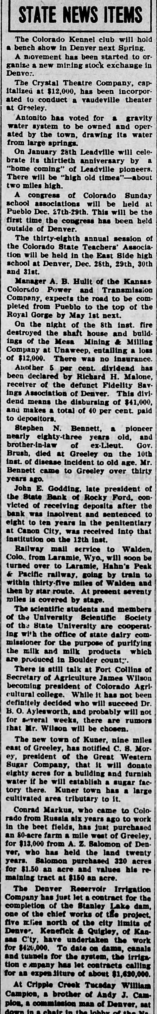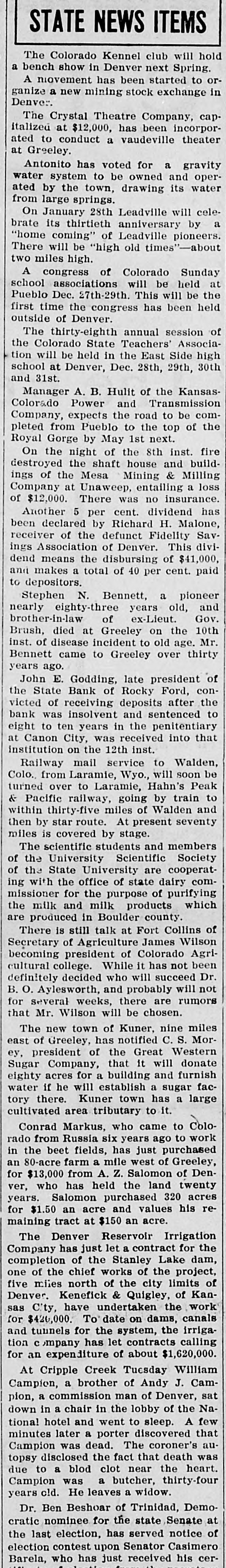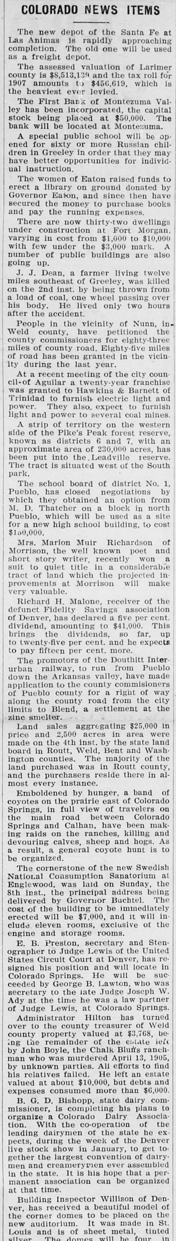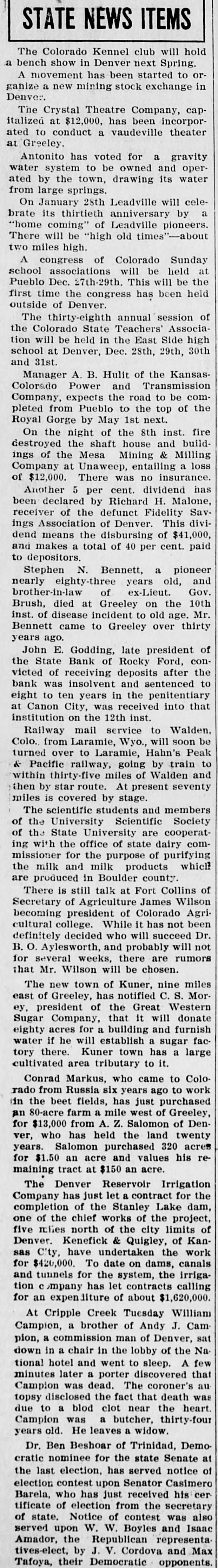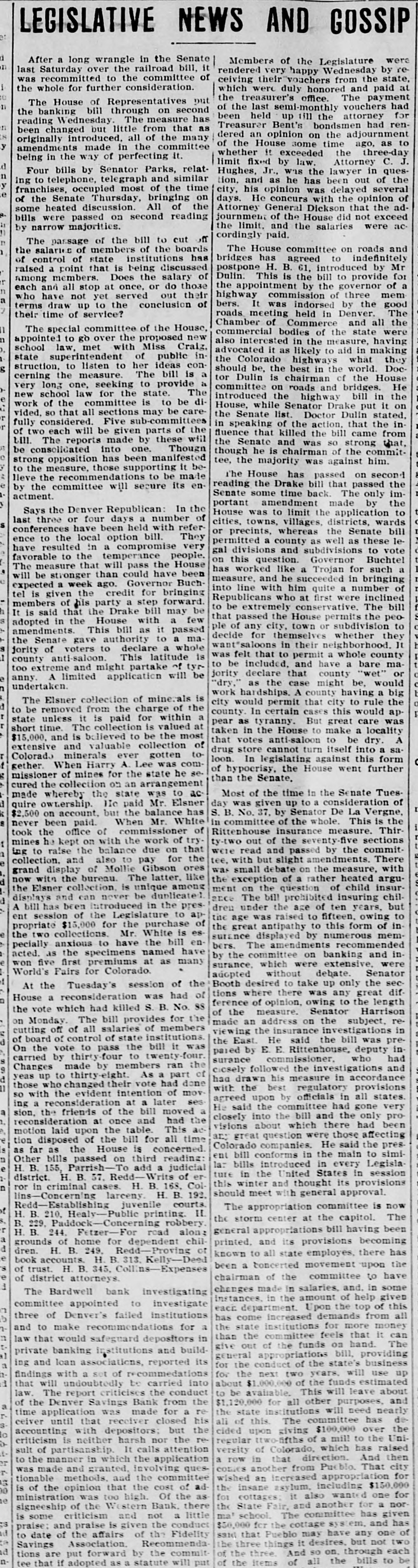 # LEGISLATIVE NEWS AND GOSSIP After a long wrangle in the Senate last Saturday over the railroad bill, it was recommitted to the committee of the whole for further consideration. The House of Representatives put the banking bill through on second reading Wednesday. The measure has been changed but little from that as originally introduced, all of the many amendments made in the committee being in the way of perfecting it. Four bills by Senator Parks, relating to telephone, telegraph and similar franchises, occupied most of the time of the Senate Thursday, bringing on some heated discussion. All of the bills were passed on second reading by narrow majorities. The passage of the bill to cut off the salaries of members of the boards of control of state institutions has raised a point that is being discussed among members. Does the salary of each and all stop at once, or do those who have not yet served out their terms draw up to the conclusion of their time of service? The special committee of the House, appointed to go over the proposed new school law, met with Miss Cralz, state superintendent of public instruction, to listen to her ideas concerning the measure. The bill is a very long one, seeking to provide a new school law for the state. The work of the committee is to be divided, so that all sections may be carefully considered. Five sub-committees of two each will be given parts of the bill. The reports made by these will be consolidated into one. Though strong opposition has been manifested to the measure, those supporting it believe the recommendations to be made by the committee will secure its enactment. Members of the Legislature were rendered very happy Wednesday by receiving their vouchers from the state, which were duly honored and paid at the treasurer's office. The payment of the last semi-monthly vouchers had been held up till the attorney for Treasurer Bent's bondsmen had rendered an opinion on the adjournment of the House some time ago, as to whether it exceeded the three-day limit fixed by law. Attorney C. J. Hughes, Jr., was the lawyer in question, and as he has been out of the city, his opinion was delayed several days. He concurs with the opinion of Attorney General Dickson that the adjournment of the House did not exceed the limit, and the salaries were accordingly paid. The House committee on roads and bridges has agreed to indefinitely postpone H. B. 61, introduced by Mr. Dulin. This is the bill to provide for the appointment by the governor of a highway commission of three members. It was indorsed by the good roads meeting held in Denver. The Chamber of Commerce and all the commercial bodies of the state were also interested in the measure, having advocated it as likely to aid in making the Colorado highways what they should be, the best in the world. Doctor Dulin is chairman of the House committee on roads and bridges. He introduced the highway bill in the House, while Senator Drake put it on the Senate list. Doctor Dulin stated, in speaking of the action, that the influence that killed the bill came from the Senate and was so strong that, though he is chairman of the committee, the majority was against him. The House has passed on second reading the Drake bill that passed the Senate some time back. The only important amendment made by the House was to limit the application to cities, towns, villages, districts, wards or precints, whereas the Senate bill permitted a county as well as these legal divisions and subdivisions to vote on this question. Governor Buchtel has worked like a Trojan for such a measure, and he succeeded in bringing into line with him quite a number of Republicans who at first were inclined to be extremely conservative. The bill that passed the House permits the people of any city, town or subdivision to decide for themselves whether they want "saloons in their neighborhood. It was felt that to permit a whole county to be included, and have a bare majority declare that county "wet" or "dry," as the case might be, would work hardships. A county having a big city would permit that city to rule the county. In certain cases this would appear as tyranny. But great care was taken in the House to make a locality that votes anti-saloon to be dry. A drug store cannot turn itself into a saloon. In legislating against this form of hypocrisy, the House went further than the Senate, Says the Denver Republican: In the last three or four days a number of conferences have been held with reference to the local option bill. They have resulted in a compromise very favorable to the temperance people. The measure that will pass the House will be stronger than could have been expected a week ago. Governor Buchtel is given the credit for bringing members of his party a step forward. It is said that the Drake bill may be adopted in the House with a few amendments. This bill as it passed the Senate gave authority to a majority of voters to declare a whole county anti-saloon. This latitude is too extreme and might partake of tyranny. A limited application will be undertaken. The Elsner collection of minerals is to be removed from the charge of the state unless it is paid for within a short time. The collection is valued at $15,000, and is believed to be the most extensive and valuable collection of Colorado minerals ever gotten together. When Harry A. Lee was commissioner of mines for the state he secured the collection on an arrangement made whereby the state was to acquire ownership. He paid Mr. Elsner $2,500 on account, but the balance has never been paid. When Mr. White took the office of commissioner of mines he kept on with the work of trying to raise the balance due on that collection, and also to pay for the grand display of Mollie Gibson ores now with the bureau. The latter, like the Elsner collection, is unique among displays and can never be duplicated. A bill has been introduced in the present session of the Legislature to appropriate $15,000 for the purch