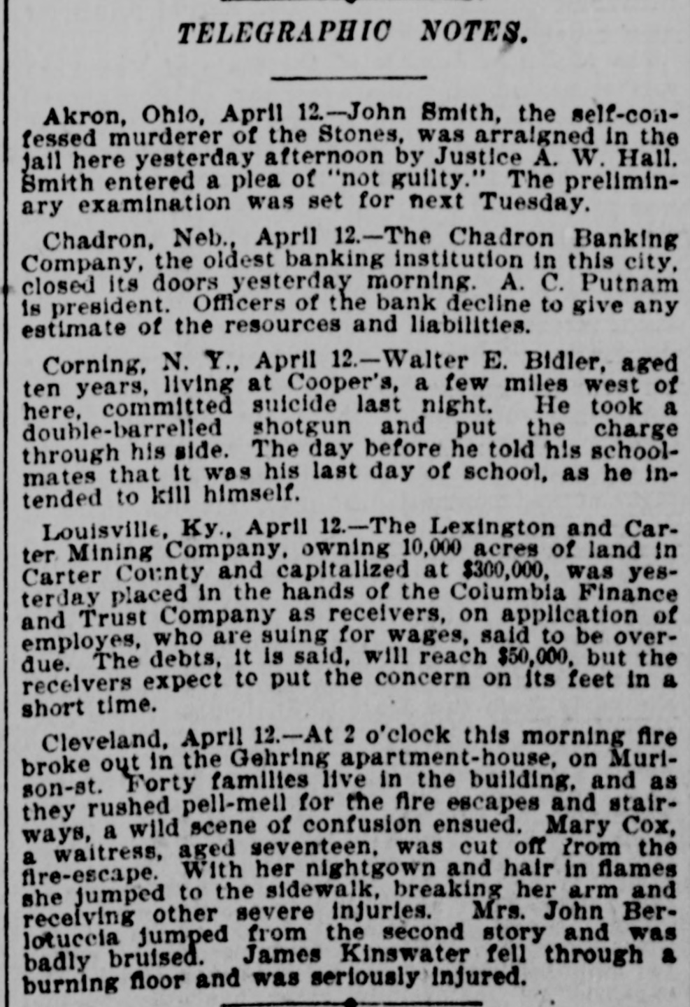 TELEGRAPHIC NOTES. Akron, Ohio, April 12.-John Smith, the self-confessed murderer of the Stones, was arraigned in the jail here yesterday afternoon by Justice A. W. Hall. Smith entered a plea of "not guilty." The preliminary examination was set for next Tuesday. Chadron, Neb., April 12.-The Chadron Banking Company, the oldest banking institution in this city, closed its doors yesterday morning. A. C. Putnam is president. Officers of the bank decline to give any estimate of the resources and liabilities. Corning, N. Y., April 12.-Walter E. Bidler, aged ten years, living at Cooper's, a few miles west of here. committed suicide last night. He took a double-barrelled shotgun and put the charge through his side. The day before he told his schoolmates that It was his last day of school, as he intended to kill himself. Louisville, Ky. April 12.-The Lexington and Carter Mining Company. owning 10,000 acres of land in Carter County and capitalized at $300,000, was yesterday placed in the hands of the Columbia Finance and Trust Company as receivers, on application of employes, who are suing for wages, said to be overdue. The debts, it is said, will reach $50,000. but the receivers expect to put the concern on its feet in a short time. Cleveland, April 12.-At 2 o'clock this morning fire broke out in the Gehring apartment-house, on Murison-st. Forty families live in the building. and as they rushed pell-mell for the fire escapes and stairways, a wild scene of confusion ensued. Mary Cox, a waitress, aged seventeen. was cut off from the fire-escape. With her nightgown and hair in flames she jumped to the sidewalk, breaking her arm and receiving other severe injuries. Mrs. John Berlotuccia jumped from the second story and was badly bruised. James Kinswater fell through a burning floor and was seriously injured.