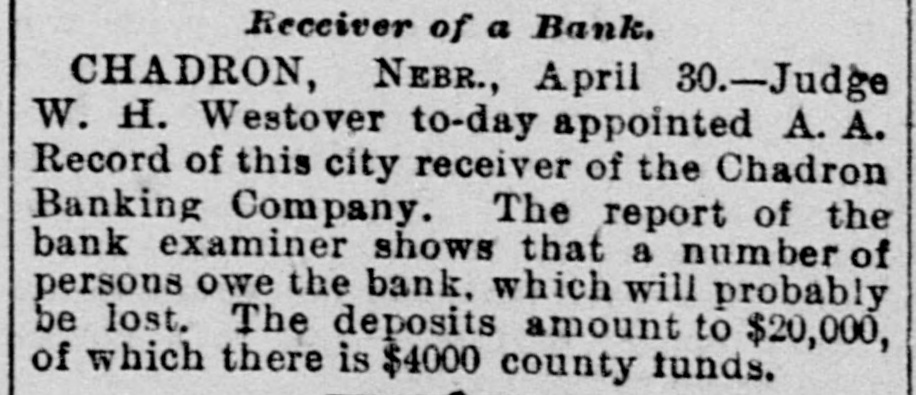 Judge W. H. Westover to-day appointed A. A. Record of this city receiver of the Chadron Banking Company. The report of the bank examiner shows that a number of persons owe the bank, which will probably be lost. The deposits amount to $20,000, of which there is $4000 county funds.