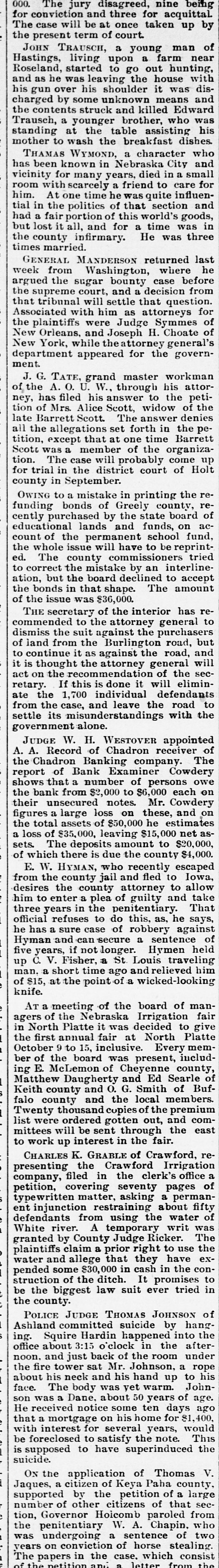 000. The jury disagreed, nine being for conviction and three for acquittal. The case will be at once taken up by the present term of court. JOHN TRAUSCH, a young man of Hastings, living upon a farm near Roseland, started to go out hunting, and as he was leaving the house with his gun over his shoulder it was discharged by some unknown means and the contents struck and killed Edward Trausch, a younger brother, who was standing at the table assisting his mother to wash the breakfast dishes. THAMAS WYMOND, a character who has been known in Nebraska City and vicinity for many years, died in a small room with scarcely a friend to care for him. At one time he was quite influential in the politics of that section and had a fair portion of this world's goods, but lost it all, and for a time was in the county infirmary. He was three times married. GENERAL MANDERSON returned last week from Washington, where he argued the sugar bounty case before the supreme court, and a decision from that tribunal will settle that question. Associated with him as attorneys for the plaintiffs were Judge Symmes of New Orleans, and Joseph H. Choate of New York, while theattorney general's department appeared for the government. J. G. TATE, grand master workman of the A. O. U. W., through his attorney, has filed his answer to the petition of Mrs. Alice Scott, widow of the late Barrett Scott. The answer denies all the allegations set forth in the petition, except that at one time Barrett Scott was a member of the organization. The case will probably come up for trial in the district court of Holt county in September. OWING to a mistake in printing the refunding bonds of Greely county, recently purchased by the state board of educational lands and funds, on account of the permanent school fund, the whole issue will have to be reprinted. The county commissioners tried to correct the mistake by an interlineation, but the board declined to accept the bonds in that shape. The amount of the issue was $36,000. THE secretary of the interior has recommended to the attorney general to dismiss the suit against the purchasers of land from the Burlington road, but to continue it as against the road, and it is thought the attorney general will act on the recommendation of the secretary. If this is done it will eliminate the 1,700 individual defendants from the case, and leave the road to settle its misunderstandings with the government alone. JUDGE W. H. WESTOVER appointed A. A. Record of Chadron receiver of the Chadron Banking company. The report of Bank Examiner Cowdery shows that a number of persons owe the bank from $2,000 to $6,000 each on their unsecured notes. Mr. Cowdery figures a large loss on these, and on the total assets of $50,000 he estimates a loss of $35,000, leaving $15,000 net as sets. The deposits amount to $20,000, of which there is due the county $4,000. E. W. HYMAN, who recently escaped from the county jail and fled to Iowa, desires the county attorney to allow him to enter a plea of guilty and take three years in the penitentiary. That official refuses to do this, as, he says, he has a sure case of robbery against Hyman and can secure a sentence of five years, if not longer. Hymen held up C. V. Fisher, a St. Louis traveling man. a short time ago and relieved him of $15, at the point of a wicked-looking knife. AT a meeting of the board of man agers of the Nebraska Irrigation fair in North Platte it was decided to give the first annual fair at North Platte October 9 to 15, inclusive. Every mem ber of the board was present, includ ing E. McLemon of Cheyenne county Matthew Daugherty and Ed Searle o Keith county and O. G. Smith of Buf falo county and the local members Twenty thousand copies of the premium list were ordered gotten out, and com mittees will be sent through the east to work up interest in the fair. CHARLES K. GRABLE of Crawford, re presenting the Crawford Irrigation company, filed in the clerk's office a petition, covering seventy pages of typewritten matter, asking a perman ent injunction restraining about fifty defendants from using the water of White river. A temporary writ was granted by County Judge Ricker. The plaintiffs claim a prior right to use the water and allege that they have expended some $30,000 in cash in the con