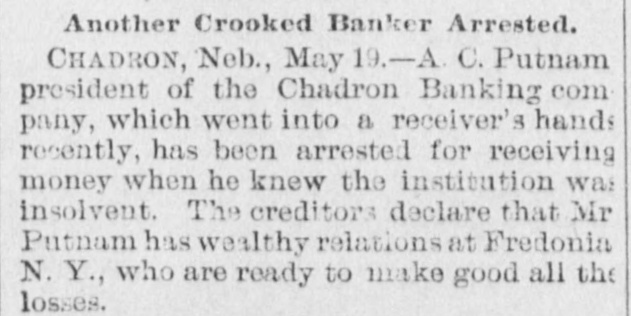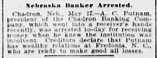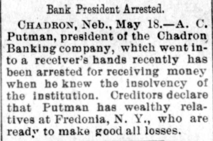 A. C. Putnam, president of the Chadron Banking Company ... was arrested to-day for receiving money when he knew the institution was insolvent.