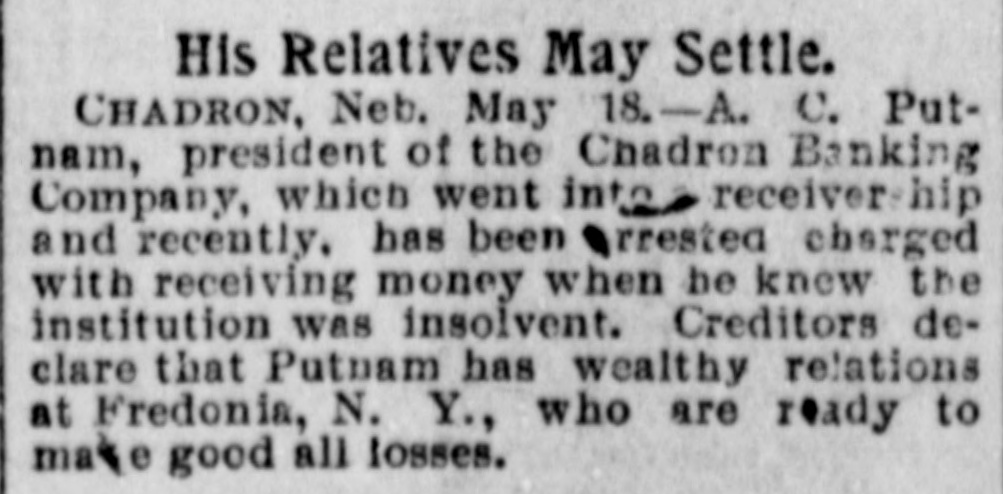 His Relatives May Settle. CHADRON, Neb. May 18.-A. C. Putnam, president of the Chadron Banking Company, which went into receivership and recently. has been rrested charged with receiving money when be knew the institution was insolvent. Creditors declare that Putnam has wealthy relations at Fredonia, N. Y., who are ready to make good all losses.