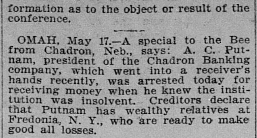 formation as to the object or result of the conference. OMAH, May 17.-A special to the Bee from Chadron, Neb., says: A. C. Putnam, president of the Chadron Banking company, which went into a receiver's hands recently, was arrested today for receiving money when he knew the institution was insolvent. Creditors declare that Putnam has wealthy relatives at Fredonia, N. Y., who are ready to make good all losses.