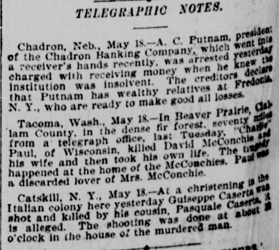 TELEGRAPHIC NOTES. Chadron, Neb., May 18.-A. C. Putnam, presiden: of the Chadron Banking Company, which went into a receiver's hands recently, was arrested yesterday charged with receiving when he knew the that institution Putnam was has insolvent. wealthy money relatives The creditors at Fredonia, declare N. Y., who are ready to make good all losses. Tacoma, Wash., May 18.-In Beaver Prairie, Clab lam County, in the dense fir forest. seventy miles from a telegraph office, last Tuesday, "Charlie" Paul, of Wisconsin, killed David McConchie and his wife and then took his own life. The tragedy was happened at the home of the McConchies. Paul a discarded lover of Mrs. McConchie. Catskill, N. Y., May 18.-At a christening is the Italian colony here yesterday Guiseppe Caserta was shot and killed by his cousin, Pasquale Caserta, n n is alleged. The shooting was done at about o'clock in the house of the murdered man.