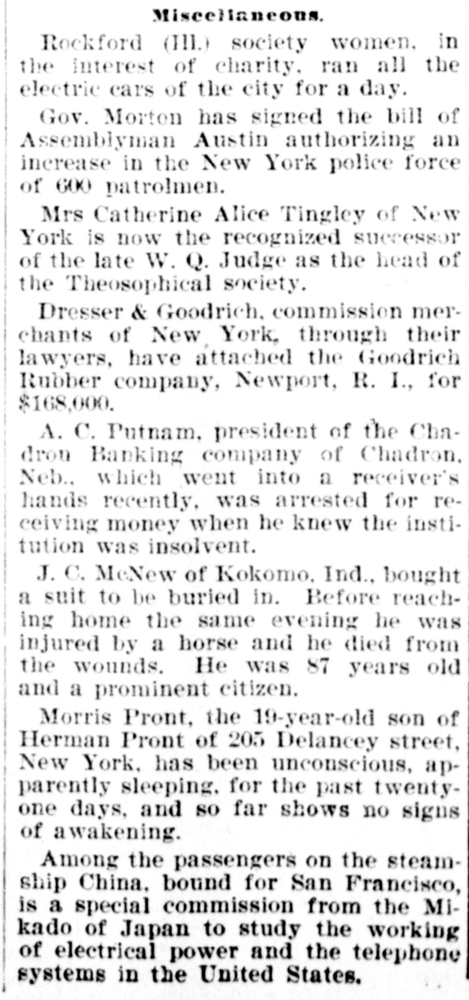 Miscellaneous. Rockford (Ill.) society women, in the interest of charity, ran all the electric cars of the city for a day. Gov. Morton has signed the bill of Assemblyman Austin authorizing an increase in the New York police force of 600 patrolmen. Mrs Catherine Alice Tingley of New York is now the recognized successor of the late W. Q. Judge as the head of the Theosophical society. Dresser & Goodrich, commission merchants of New York, through their lawyers, have attached the Goodrich Rubber company, Newport, R. I., for $168,000. A. C. Putnam, president of the Chadron Banking company of Chadron, Neb., which went into a receiver's hands recently, was arrested for receiving money when he knew the institution was insolvent. J. C. McNew of Kokomo, Ind., bought a suit to be buried in. Before reaching home the same evening he was injured by a horse and he died from the wounds. He was 87 years old and a prominent citizen. Morris Pront, the 19-year-old son of Herman Pront of 205 Delancey street, New York, has been unconscious, apparently sleeping, for the past twenty-one days, and so far shows no signs of awakening. Among the passengers on the steamship China, bound for San Francisco, is a special commission from the Mikado of Japan to study the working of electrical power and the telephone systems in the United States.