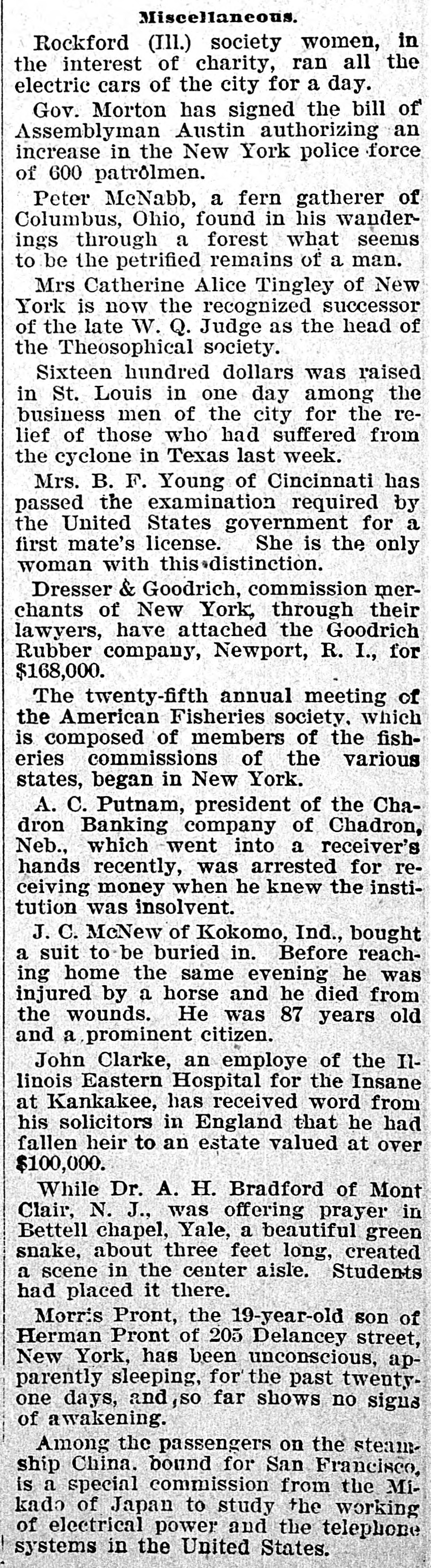 # Miscellaneous. Rockford (Ill.) society women, in the interest of charity, ran all the electric cars of the city for a day. Gov. Morton has signed the bill of Assemblyman Austin authorizing an increase in the New York police force of 600 patrolmen. Peter McNabb, a fern gatherer of Columbus, Ohio, found in his wanderings through a forest what seems to be the petrified remains of a man. Mrs Catherine Alice Tingley of New York is now the recognized successor of the late W. Q. Judge as the head of the Theosophical society. Sixteen hundred dollars was raised in St. Louis in one day among the business men of the city for the relief of those who had suffered from the cyclone in Texas last week. Mrs. B. F. Young of Cincinnati has passed the examination required by the United States government for a first mate's license. She is the only woman with this distinction. Dresser & Goodrich, commission merchants of New York, through their lawyers, have attached the Goodrich Rubber company, Newport, R. I., for $168,000. The twenty-fifth annual meeting of the American Fisheries society, which is composed of members of the fisheries commissions of the various states, began in New York. A. C. Putnam, president of the Chadron Banking company of Chadron, Neb., which went into a receiver's hands recently, was arrested for receiving money when he knew the institution was insolvent. J. C. McNew of Kokomo, Ind., bought a suit to be buried in. Before reaching home the same evening he was injured by a horse and he died from the wounds. He was 87 years old and a prominent citizen. John Clarke, an employe of the Illinois Eastern Hospital for the Insane at Kankakee, has received word from his solicitors in England that he had fallen heir to an estate valued at over $100,000. While Dr. A. H. Bradford of Mont Clair, N. J., was offering prayer in Bettell chapel, Yale, a beautiful green snake, about three feet long, created a scene in the center aisle. Students had placed it there. Morris Pront, the 19-year-old son of Herman Pront of 205 Delancey street, New York, has been unconscious, apparently sleeping, for the past twenty-one days, and so far shows no signs of awakening. Among the passengers on the steamship China. bound for San Francisco, is a special commission from the Mikado of Japan to study the working of electrical power and the telephone systems in the United States.