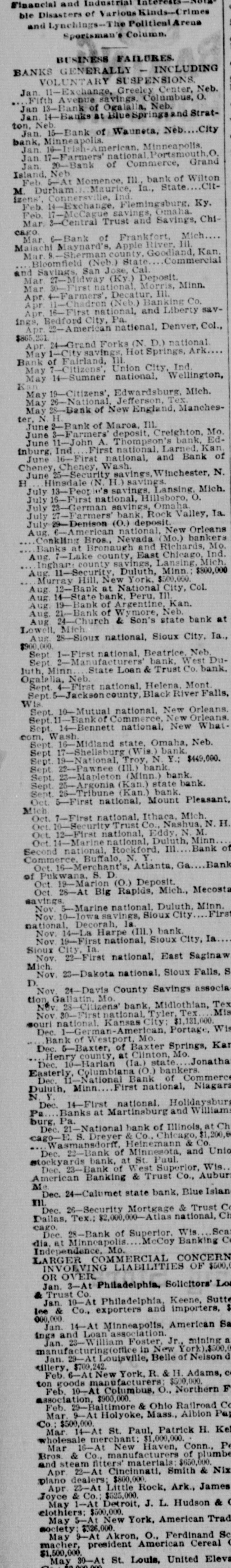 Mar. 9.-Sherman county, Goodland, Kan. Bloomfield (Neb.) State Commercial and Savings, San Jose, Cal. Mar 27-Midway (Ky.) Deposit. Mar 30-First national, Morris, Minn. Apr. 4--Farmers', Decatur, III. Apr 11-Chadron (Neb.) Banking Co. Apr. 16-First national, and Liberty savings. Bedford City, Pa. Apr. 22-American national, Denver, Col., $865,231. Apr. 24-Grand Forks (N. D.) national May 1-City savings, Hot Springs, Ark.... Bank of Fairland, III. May 7-Citizens', Union City, Ind. May 14-Sumner national, Wellington, Kan May 19-Citizens', Edwardsburg, Mich. May 26-National, Jefferson. Tex. May 28-Bank of New England, Manchester, N H. June 2-Bank of Maroa, Ill. June 3-Farmers' deposit, Creighton, Mo. June 11-John A. Thompson's bank, Edinburg. Ind First national. Larned, Kan. June 16-First national, and Bank of Cheney Cheney, Wash. June 25-Security savings, Winchester, N. Hinsdale (N. H.) savings. H July 13-Peot It's savings. Lansing, Mich. July 16-First national, Hillsboro, O. July 23-German savings, Omaha July 27-Farmers' bank, Rock Valley, Ia. July 29-Denison (O.) deposit. Aug. 6-American national, New Orleans Conkling Bros, Nevada (Mo.) bankers Banks at Bronaugh and Richards, Mo. Aug. 7-Lake county, East Chicago, Ind. Inghar: county savings, Lansing, Mich. Aug. 11-Security, Duluth, Minn.: $800,000 Murray Hill, New York, $500,000. Aug 12-Bank at National City, Col. Aug 14-State bank. Peru, Ill. Aug 19-Bank of Argentine, Kan. Aug. 21-Bank of Wymore, Neb. Aug 24-Church & Son's state bank at Lowell, Mich Aug. 28-Sioux national, Sioux City, Ia., $900.000 Sept 1-First national, Beatrice. Neb. Sept 2-Manufacturers' bank, West DuJuth, Minn State Loan & Trust Co. bank. Ogalalla, Neb. Sept. 4-First national. Helena, Mont. Sept. 5-Jackson county, Black River Falls, Wis. Sept. 10-Mutual national, New Orleans. Sept. 11-Bankof Commerce, New Orleans. Sept. 14-Bennett national, New Whatcom. Wash Sept. 16-Midland state, Omaha, Neb. Sept 17-Shellsburg (Wis.) bank. Sept. 19-National, Troy, N. Y.; $449,000. Sept. 22-Pawnee (III.) bank. Sept. 23-Mapleton (Minn.) bank. Sept. 25-Argonia (Kan.) state bank. Sent. 26-Tribune (Kan.) bank. Oct. 5-First national, Mount Pleasant, Mich Oct. 7-First national, Ithaca, Mich. Oct. 10-Security Trust Co., Nashua, N. H. Oct. 12-First national, Eddy. N. M. Oct. 14-Marine national, Duluth, Minn Second national, Rockford, Ill Bank of Commerce. Buffalo, N. Y. Bank Oct. 16-Merchant's, Atlanta, Ga of Pukwana, S. D. Oct. 19-Marion (0.) Deposit. Oct. 28-At Big Rapids, Mich., Mecosta savings. Nov. 5-Marine national, Duluth, Minn. Nov. 10-Iowa savings, Sloux City First national, Decorah, la. Nov. 14-La Harpe (III.) bank. Nov 19-First national, Sioux City, Ia Sioux City, Ia. Nov. 22-First national, East Saginaw Mich. Nov. 23-Dakota national, Sloux Falls, S D. Nov. 24-Davis County Savings associa tion Gallatin, Mo. Nov. 28-Citizens' bank, Midlothian, Tex Mis Nov. 30-First national, Tyler, Tex souri national. Kansas City: $1,131,000. Dec. 1-German-American, Portage, Wis Bank of Westport, Mo. Dec. 5-Baxter, of Baxter Springs, Kar Henry county, at Clinton, Mo. Dec. 10-Harlan (Ia.) state Jonatha Easterly, Columbiana (O.) bankers. Dec. 11-National Bank of Commerce Duluth, Minn First national, Niagara N.Y. Dec. 14-First national. Holidaysburg Pa Banks at Martinsburg and William burg, Pa. Dec. -National bank of Illinois, at Ch cago-E. S. Dreyer & Co., Chicago, $1,200,80 Wasmansdorff, Heinemann & Co. Dec. 22-Bank of Minnesota, and Unio stockyards bank, at St. Paul. Dec. 23-Bank of West Superior, Wis American Banking & Trust Co., Aubur Me. Dec. 24-Calumet state bank, Blue Islan III. Dec. 26-Security Mortgage & Trust Co Dallas, Tex.: $2,000,000-Atlas national, Ch cago. Dec. 28-Bank of Superior. Wis Sca dia, at Minneapolis McCoy Banking C Independence, Mo. LARGER COMMERCIAL CONCERN INVOLVING LIABILITIES OF $500,0