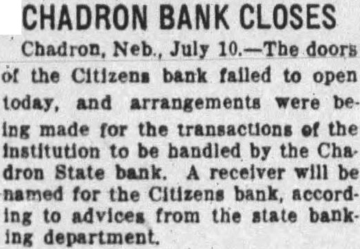 CHADRON BANK CLOSES Chadron, Neb., July doors of the Citizens bank failed to open today, and arrangements were be ing made for the transactions of the institution to be handled by the Cha dron State bank. receiver will be named for the Citizens bank, accord ing to advices from the state bank ing department.