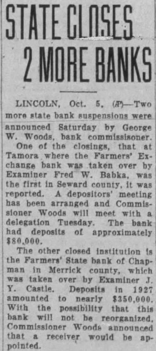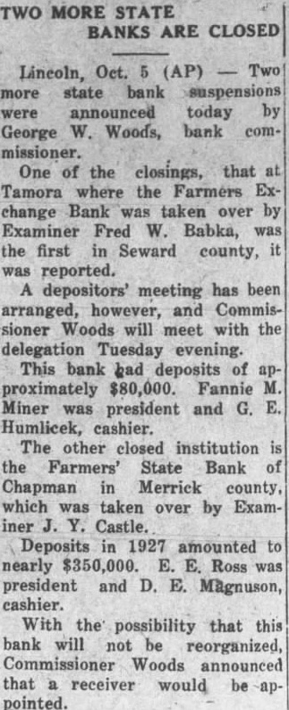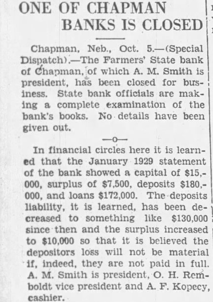 ONE OF CHAPMAN BANKS IS CLOSED Chapman, Oct. Farmers' State bank which Smith president, has been closed for iness. State bank officials ing complete examination the bank's books. No details have been out. In financial circles here learnthat January 1929 statement bank showed capital of surplus of deposits $172,000. deposits liability, learned, has been creased something $130,000 since then and the increased $10,000 that believed the depositors loss will not be indeed, they are in Smith president, Remboldt vice president and Kopecy, cashier.