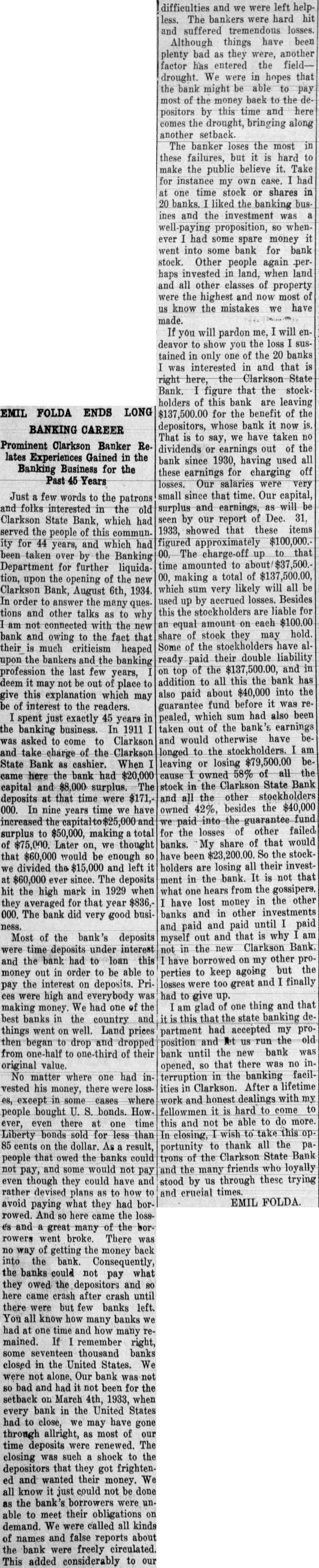 EMIL FOLDA ENDS LONG BANKING CAREER Prominent Clarkson Banker Relates Experiences Gained in the Banking Business for the Past 45 Years Just a few words to the patrons and folks interested in the old Clarkson State Bank, which had served the people of this community for 44 years, and which had been taken over by the Banking Department for further liquidation, upon the opening of the new Clarkson Bank, August 6th, 1934. In order to answer the many questions and other talks as to why am not connected with the new bank and owing to the fact that their is much criticism heaped upon the bankers and the banking profession the last few years, deem it may not be out of place to give this explanation which may be of interest to the readers. I spent just exactly 45 years in the banking business. In 1911 was asked to come to Clarkson and take charge of the Clarkson State Bank as cashier. When I came here the bank had $20,000 capital and $8,000 surplus. The deposits at that time were $171,000. In nine years time we have increased the capitalto$25,000 and surplus to $50,000, making total of $75,000. Later on, we thought that $60,000 would be enough so we divided the $15,000 and left it at $60,000 ever since. The deposits hit the high mark in 1929 when they averaged for that year $836,000. The bank did very good business. Most of the bank's deposits were time deposits under interest and the bank had to loan this money out in order to be able to pay the interest on deposits. Prices were high and everybody was making money. We had one of the best banks in the country and things went on well. Land prices then began to drop and dropped from one-half to one-third of their original value. No matter where one had invested his money, there were losses, except in some cases where people bought U. S. bonds. However, even there at one time Liberty bonds sold for less than 85 cents on the dollar. As a result, people that owed the banks could not pay, and some would not pay even though they could have and rather devised plans as to how to avoid paying what they had borrowed. And so here came the losses and a great many of the borrowers went broke. There was no way of getting the money back into the bank. Consequently, the banks could not pay what they owed the depositors and SO here came crash after crash until there were but few banks left. You all know how many banks we had at one time and how many remained. If I remember right, some seventeen thousand banks closed in the United States. We were not alone. Our bank was not SO bad and had it not been for the setback on March 4th, 1933, when every bank in the United States had to close, we may have gone through allright, as most of our time deposits were renewed. The closing was such a shock to the depositors that they got frightened and wanted their money. We all know it just could not be done as the bank's borrowers were unable to meet their obligations on demand. We were called all kinds of names and false reports about the bank were freely circulated. This added considerably to our and suffered tremendous losses. Although things have been plenty bad as they were, another factor has entered the fielddrought. We were in hopes that the bank might be able to pay most of the money back to the depositors by this time and here comes the drought, bringing along another setback. The banker loses the most in these failures, but it is hard to make the public believe it. Take for instance my own case. I had at one time stock or shares in 20 banks. I liked the banking busines and the investment was a well paying proposition, SO whenever I had some spare money it went into some bank for bank stock. Other people again perhaps invested in land, when land and all other classes of property were the highest and now most of us know the mistakes we have made. If you will pardon me, I will endeavor to show you the loss sustained in only one of the 20 banks I was interested in and that is the Clarkson Bank. I figure that the stockholders of this bank are leaving $137,500.00 for the benefit of the depositors, whose bank it now is. That is to say, we have taken no dividends or earnings out of the bank since 1930, having used all these earnings for charging off losses. Our salaries were very small since that time. Our capital, surplus and earnings, as will be seen by our report of Dec. 31, 1933, showed that these items figured approximately $100,000.00. The charge-off up to that time amounted to 00, making a total of $137,500.00, which sum very likely will all be used up by accrued losses. Besides this the stockholders are liable for an equal amount on each $100.00 share of stock they may hold. Some of the stockholders have already paid their double liability on top of the $137,500.00, and in addition to all this the bank has also paid about $40,000 into the guarantee fund before it was repealed, which sum had also been taken out of the bank's earnings and would otherwise have belonged to the stockholders. I am leaving or losing $79,500.00 because I owned 58% of all the stock in the Clarkson State Bank and all the other stockholders owned 42%, besides the $40,000 paid the guarantee fund for the losses of other failed banks. My share of that would have been $23,200.00. So the stockholders are losing all their investment in the bank. It is not that what one hears from the gossipers. have lost money in the other banks and in other investments and paid and paid until I paid myself out and that is why I am not in the new Clarkson Bank. have borrowed on my other properties to keep agoing but the losses were too great and I finally had to give up. am glad of one thing and that it is this that the state banking department had accepted my proposition and let us run the old bank until the new bank was opened, SO that there was no interruption in the banking facilities in Clarkson. After a lifetime work and honest dealings with my fellowmen it is hard to come to this and not be able to do more. In 