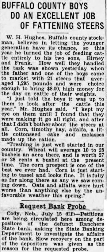 BUFFALO COUNTY BOYS DO AN JOB OF FATTENING STEERS W. H. Hughes, Buffalo county stockman, in letting the younger its this he turned the job of feeding catentirely his two sons, Birney and Frank. How they handled the task when the father and one of the boys came market with 21 steers that averaged 1,295 pounds and choice enough to bring high money for the day on of weights. just told the them cattle this year," Mr. Hughes said. kept my eye on them until found that they making go all right, and after didn't bother the steers timothy hay, alfalfa, tle and made up the "Treshing just well started in our country. Wheat will average 10 bushels an acre there, and is worth 28 cents bushel the present The is ever Corn just starting tassel and looks fine. far along there any ing down. Oats and alfalfa were hurt worse than else the unfavorable weather this spring. Request Bank Probe Cody Neb., July among positors the defunct Ranchers State bank, asking the State Banking Department to investigate the affairs the the on the was given the reason for the requested probe.