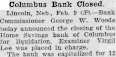 Columbus Bank Closed. Lincoln, Neb., Feb. 9 (P).-Bank Commissioner George W. Woods today announced the closing of the Home Savings bank of Columbus for liquidation. Examiner Virgil Lee was placed in charge. The bank was capitalized for 12