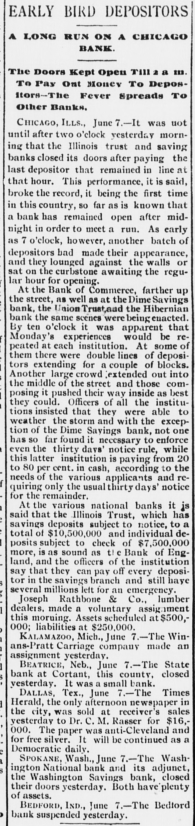 EARLY BIRD DEPOSITORS A LONG RUN ON A CHICAGO BANK. The Doors Kept Open Till 2 a m. To Pay Ont Money To Depositors-The Fever Spreads To Other Banks. CHICAGO, ILLS., June 7.-It was uot until after two o'clock yesterday morning that the Illinois trust and saving banks closed its doors after paying the last depositor that remained in line at that hour. This performance, it is said, broke the record, it being the first time in this country, so far as is known that a bank has remained open after midnight in order to meet a run. As early as 7 o'clock, however, another batch of depositors bad made their appearance, and they lounged against the walls or sat on the curbstone awaiting the regular hour for opening. At the Bank of Commerce, farther up the street, as well as at the Dime Savings bank, the Union Trust,aud the Hibernian bank the same scenes were being enacted. By ten o'clock it was apparent that Monday's experiences would be repeated at each institution. At some of them there were double lines of depositors extending for a couple of blocks. Another large crowd (extended out into the middle of the street and those composing it pushed their way inside as best they could. Officers of all the institutions insisted that they were able to weather the storm and with the exception of the Dime Sayings bank, not one has so far found it necessary to enforce even the thirty days' notice rule, while this latter institution is paying from 20 to 80 per cent. in cash, according to the needs of the various applicants and requiring only the usual thirty days' notice for the remainder. At the various national banks it is said that the Illinois Trust, which has savings deposits subject to notice, to a total of $10,500,000 and individual deposits subject to check of $7,500,000 more, is as sound as the Bank of England, and the officers of the institution say that they can pay off every depositor in the savings branch and still haye several millions left for an emergency. Joseph Rathbone & Co., lumber dealers. made a voluntary assignment this morning. Assets scheduled at $500,000; liabilities at $250,000. KALAMAZOO, Mich., June 7.-The Winans-Pratt Carriage company made an assignment yesterday. BEATRICE, Neb., June 7.-The State bank at Cortant, this county, closed vesterday. It was a small bank. DALLAS, Tex., June 7.-The Times Herald, the only afternoon newspaper in the city, was sold at receiver's sales yesterday to Dr. c. M. Rasser for $16,000. The paper was anti-Cleveland and for free silver. It will be continued as a Democratic daily. SPOKANE, Wash., June 7.-The Washington National bank and its adjunct, the Washington Savings bank, closed their doors yesterday. Both have plenty of assets. BEDFORD, IND., June 7.-The Bedford bank suspended yesterday.