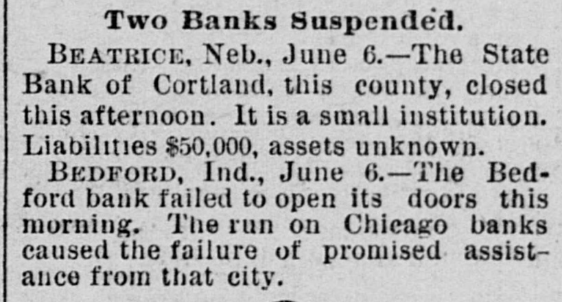 Two Banks Suspended. BEATRICE, Neb., June 6.-The State Bank of Cortland, this county, closed this afternoon. It is a small institution. Liabilities $50,000, assets unknown. BEDFORD, Ind., June 6.-The Bedford bank failed to open its doors this morning. The run on Chicago banks caused the failure of promised assistance from that city.