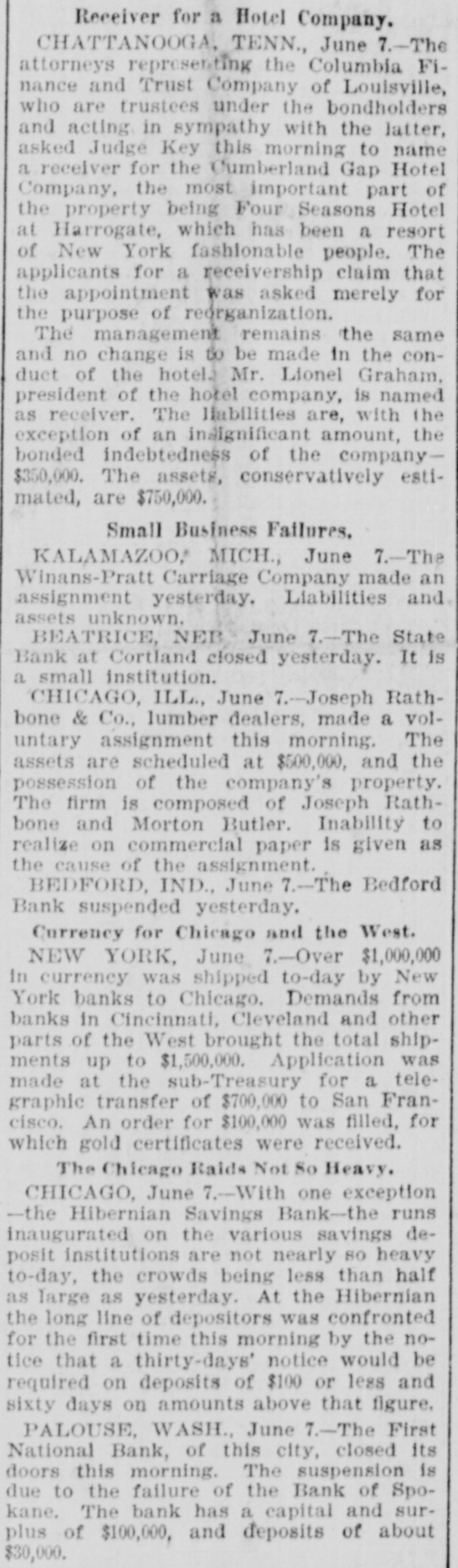 Receiver for a Hotel Company. CHATTANOOGA, TENN., June 7.-The attorneys representing the Columbia Finance and Trust Company of Louisville, who are trustees under the bondholders and acting in sympathy with the latter, asked Judge Key this morning to name a receiver for the Cumberland Gap Hotel Company, the most important part of the property being Four Seasons Hotel at Harrogate, which has been a resort of New York fashionable people. The applicants for a receivership claim that the appointment was asked merely for the purpose of reorganization. The management remains the same and no change is to be made in the conduet of the hotel. Mr. Lionel Graham, president of the hotel company, is named as receiver. The liabilities are, with the exception of an insignificant amount, the bonded indebtedness of the company$350,000. The assets, conservatively estimated, are $750,000. Small Business Failures. KALAMAZOO, MICH., June 7.-The Winans-Pratt Carriage Company made an assignment yesterday. Liabilities and assets unknown. BEATRICE, NEB June 7.-The State Bank at Cortland closed yesterday. It is a small institution. CHICAGO, ILL., June 7.-Joseph Rathbone & Co., lumber dealers, made a voluntary assignment this morning. The assets are scheduled at $500,000, and the possession of the company's property. The firm is composed of Joseph Rathbone and Morton Butler. Inability to realize on commercial paper is given as the cause of the assignment. BEDFORD, IND., June 7.-The Bedford Bank suspended yesterday. Currency for Chicago and the West. NEW YORK, June 7.-Over $1,000,000 in currency was shipped to-day by New York banks to Chicago. Demands from banks in Cincinnati, Cleveland and other parts of the West brought the total shipments up to $1,500,000. Application was made at the sub-Treasury for a telegraphic transfer of $700,000 to San Francisco. An order for $100,000 was filled, for which gold certificates were received. The Chicago Raids Not So Heavy. CHICAGO, June 7.-With one exception -the Hibernian Savings Bank-the runs inaugurated on the various savings deposit institutions are not nearly so heavy to-day, the crowds being less than half as large as yesterday. At the Hibernian the long line of depositors was confronted for the first time this morning by the notice that a thirty-days' notice would be required on deposits of $100 or less and sixty days on amounts above that figure. PALOUSE, WASH. June 7.-The First National Bank, of this city, closed its doors this morning. The suspension is due to the failure of the Bank of Spokane. The bank has a capital and surplus of $100,000, and deposits of about $30,000.