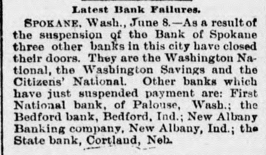 Latest Bank Failures. SPOKANE. Wash., June 8.-As a result of the suspension of the Bank of Spokane three other banks in this city have closed their doors. They are the Washington National, the Washington Savings and the Citizens' National. Other banks which have just suspended payment are: First National bank, of Palouse, Wash.: the Bedford bank, Bedford, Ind.; New Albany Banking company, New Albany, Ind.; the State bank, Cortland, Neb.