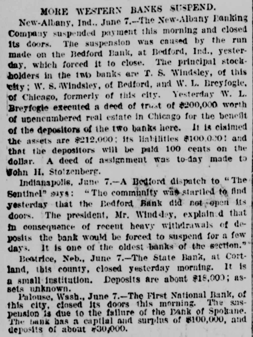 MORE WESTERN BANKS SUSPEND. New-Albany. Ind.. June T.-The New-Albany Banking Company suspended payment this morning and closed its doors. The suspension was caused by the run made on the Bedford Bank, at Bedford, Ind., yesterday, which forced it to close. The principal stock. holders in the 186 banks are T. S. Windsley, of this city; W. S. Windsley, of Bedford, and W. L. Breyfogle, of Chicago, formerly of this city. Yesterday W. L. Breyfogle executed a deed of trust of $200,000 worth of upencumbered real estate in Chicago for the benefit of the depositors of the two banks here. 11 is claimed the assets are $212,000; its liabilities $100,000: and that the depositors will be paid 100 cents on the dollar. A deed of assignment was to-day made to John H. Stotzenberg. Indianapolis, June 7.-A Bedford dispatch to "The Sentinel" says: "The community was-startled to find yesterday that the Bedford Bank did not open Its doors. The president, Mr. Wind day, explained that in consequence of recent heavy withdrawals of deposits the bank would be forced to suspend for a few days. It is one of the oldest banks of the section." Beatrice, Neb., June 7.-The State Bank, at Cortland, this county, closed yesterday morning. It is a small institution. Deposits are about $18,000; assets unknown. Palouse, Wash., June 7.-The First National Bank, of this city, closed Its doors this morning. The suspension is due to the failure of the rank of Spokane. The bank has a capital and surplus of $100,000, and deposits of about 30,000.