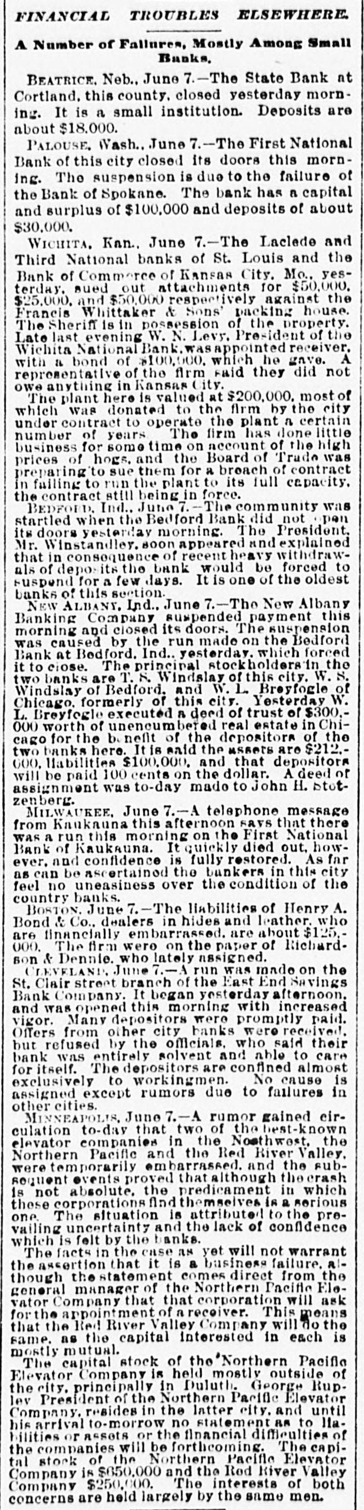ELSEWHERE. FINANCIAL TROUBLES A Number of Failures, Mostly Among Small Banks, BEATRICE. Neb., June 7.-The State Bank at Cortland. this county. closed yesterday morning. It is a small institution. Deposits are about $18.000. PALOUSE. Wash.. June 7.-The First National Bank of this city closed its doors this morning. The suspension is due to the failure of the Bank of Spokane. The bank has a capital and surplus of $100,000 and deposits of about $30,000. WICHITA. Kan., June 7.-The Laclede and Third National banks of St. Louis and the Bank of Commerce of Kansas City. Mo., yesterday. sued out attachments for $50,000. $25,000. and $50,000 respectively against the Francis Whittaker & Sons' packing house. The Sheriff is in possession of the property. Late last evening W. N. Levy. President of the Wichita National Bank. was appointed receiver. A with is bond of $100,000. which he gave. representative of the firm said they did not owe anything in Kansas City. The plant here is valued at $200,000. most of which was donated to the firm by the city under contract to operate the plant a certain number of years The firm has done little business for some time on account of the high prices of hogs. and the Board of Trade was preparing to sue them for a breach of contract in failing to run the plant to its full capacity. the contract still being in force. BEDFORD, Ind.. June The community was startled when the Bedford Bank did not pen its doors yesterday morning. The President, Mr. Winstandler. soon appeared and explained that in consequence of recent heavy withdrawals of depos its the bank would be forced to suspend for a few days. It is one of the oldest banks of this section. NEW ALBANY. Ind.. June 7.-The New Albany Banking Company suspended payment this morning and closed its doors. The suspension was caused by the run made on the Bedford Bank at Bedford. Ind.. yesterday. which forced it to close. The principal stockholders in the two banks are T. S. Windslay of this city. W. S. Windslay of Bedford. and W.L. Breyfogle of Chicago. formerly of this city. Yesterday W. L. Breyfogle executed a deed of trust of $300.000 worth of unencumbered real estate in Chicago for the b. nefit of the depositors of the two banks here. It is said the assets are $212. 000. liabilities $100,000. and that depositors will be paid 100 cents on the dollar. deed of assignment was to-day mado to john H. stotzenberg. MILWAUKEE. June 7.-A telephone message from Kankauna this afternoon FRYS that there was a run this morning on the First National Bank of Kaukauna. It quickly died out. however. and confidence is fully restored. As far as can be ascertained the bankers in this city feel no uneasiness over the condition of the country banks. BOSTON. June -The liabilities of Henry A. Bond Co., dealers in hides and leather. who are financially embarrassed. are about $125, 000. The firm were on the paper of Richardson & Dennie. who lately assigned. CLEVELAND, June 7.-Arun was made on the St. Clair street branch of the East End Savings Bank Company. It began yesterday afternoon. and was opened this morning with increased vigor. Many depositors were promptly paid. Offers from other city banks were received. but refused by the officials. who said their bank was entirely solvent and able to care for itself. The depositors are confined almost exclusively to workingmen. No cause is assigned except rumors due to failures in other cities. MINNEAPOLIS June 7.-A rumor gained eirculation -day that two of the best-known elevator companies in the Northwest, the Northern Pacific and the Red River Valley. were temporarily embarrassed. and the subsequent events proved that although the crash is not absolute. the predicament in which these corporations find themselves is a serious one The situation is attributed to the prevailing uncertainty and the lack of confidence which is felt by the banks. The facts in the case as yet will not warrant the assertion that it is a business failure. although the statement comes direct from the general manager of the Northern Pacific Flovator Company that that corporation will ask for the appointment of a receiver. This means that the Red River Valley Company will do the same. as the capital interested in each is mostly mutual. The capital stock of the Northern Pacific Elevator Company is held mostly outside of the city. principally in Duluth. George Ruplev President of the Northern Parific Elevator Company. resides in the latter city. and until his arrival morrow no statement as to llabilities or Assets or the financial difficulties of the companies will be forthcoming. The capital stock of the Northern Pacific Elevator Company is $650,000 and the Red River Valley Company $250,000. The interests of both concerns are held largely by the same men.