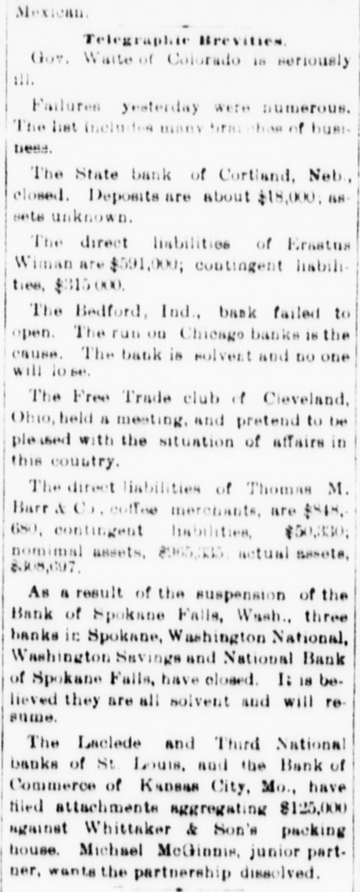 Mexican Telegraphte Brevities Gov. Waite of Colorado 18 seriously 111. Failures yesterday were numerous. The hat includes many chan of business. The State bank of Cortland, Neb. closed. Deposits are about $18,000. 88 sets unknown. The direct liabilities of Erastus Wiman are $591,000; contingent habili tree, $315000 The Bedford, Ind., bank failed to open. The run on Chicago banks 18 the cause. The bank is solvent and no one will lose. The Free Trade club of Cieveland, Ohio, held a meeting and pretend to be pleased with the situation of affairs in this country. The direct liabilities of Thomas M. Barr & Co. coffee merchants, are $818. 680, contingent habilities $50,330; nominal assets, 8965,335 actual assets, $408,697 As a result of the suspension of the Bank of Spokane Falls, Wash. three banks in Spokane, Washington National, Washington Savings and National Bank of Spokane Falls, have closed. I: is be. lieved they are all solvent and will resame The Laclede and Third National banks of St. Louis, and the Bank of Commerce of Kansas City, Mo., have filed attachments aggregating $125,000 Whittaker & Son's packing house. Michael McGinne, junior part. ner. wants the partnership dissolved.