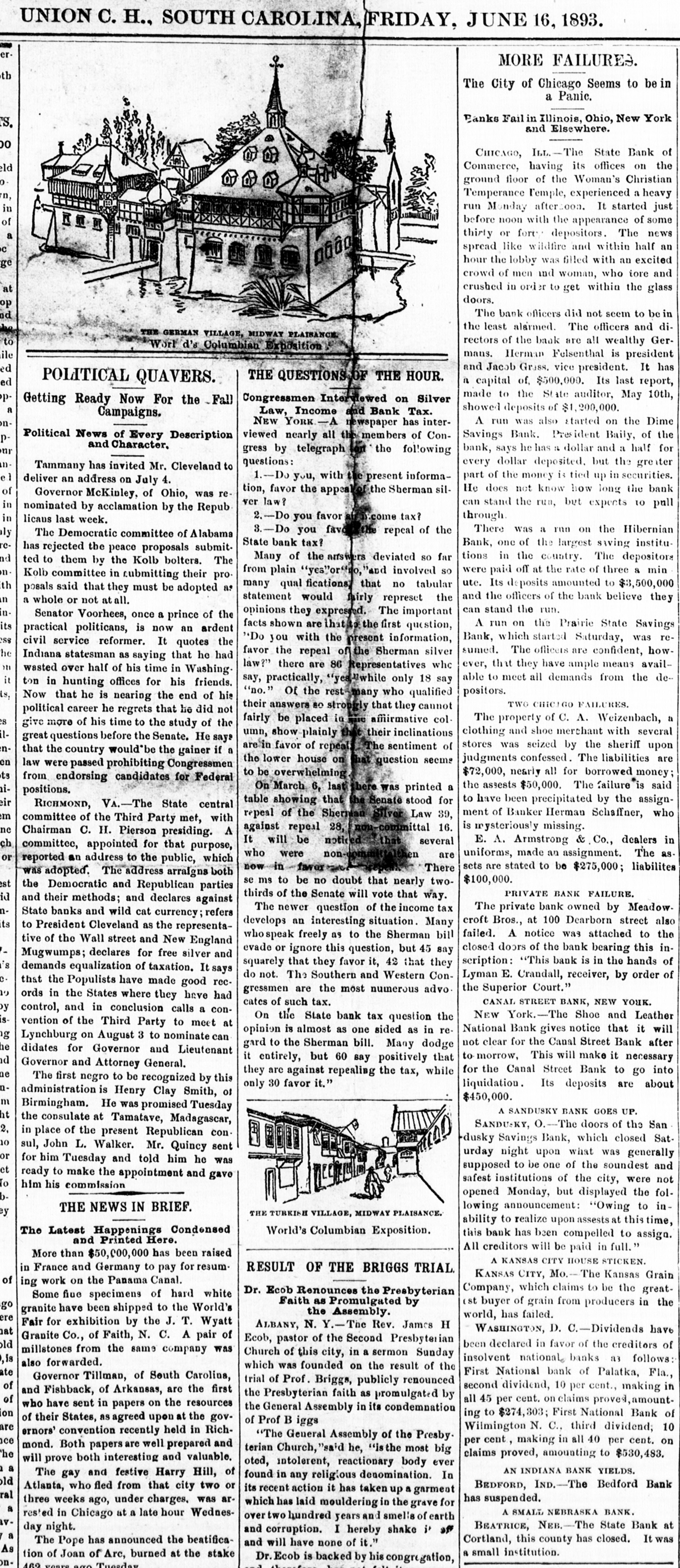 1893. UNION C. H., SOUTH CAROLINA, FRIDAY, JUNE 16, erMORE FAILUREA. th The City of Chicago Seems to be in a Panic. Banks Fail in Illinois, Ohio, New York TS. and Elsewhere. DO CHICAGO, ILL.-The State Bank of eld Commerce, having its offices on the ground floor of the Woman's Christian 0 Temperance Temple, experienced a heavy n, in run Monday aftersoon. It started just of before noon with the appearance of some thirty or fore depositors. The news a spread like wildfire and within half an c hour the lobby was filled with an excited ge crowd of men and woman, who tore and at crushed in order to get within the glass doors. op The bank officers did not seem to be in nd the least alarmed. The officers and diTHE GERMAN VILLAGE, MIDWAY PLAISANCE to rectors of the bank are all wealthy GerWorl d's Columbian Exposition ile mans. Herman Felsenthal is president led and Jacob Gross. vice president. It has THE QUESTIONS THE HOUR. POLITICAL QUAVERS. led n capital of, $500,000. Its last report, made to the State auditor, May 10th, P Congressmen Interviewed on Silver Getting Ready Now For the Fall showed deposits of $1,200,000. a Law, Income and Bank Tax. Campaigns. A run was also started on the Dime on NEW YORK newspaper has interPolitical News of Every Description viewed nearly all the members of ConSavings Bank. President Baily, of the p and Character, bank, says he has it dollar and a half for n gress by telegraph the following questions: in every dollar deposited. but the greater Tammany has invited Mr. Cleveland to part of the money is tied up in securities. you, with present informadeliver an address on July 4. He does not know how long the bank of tion, favor the appealor the Sherman silGovernor McKinley, of Ohio, was rever law? in can stand the run, but expects to pull nominated by acclamation by the Repub through in 2.-Do you favor and Ecome tax? licaus last week. There was a run on the Hibernian 3.-Do you favorithe repeal of the ly The Democratic committee of Alabama State bank tax? Bank, one of the largest saving institurehas rejected the peace proposals submitMany of the answers deviated so far nd tions in the country. The depositors ted to them by the Kolb bolters. The were paid off at the rate of three a min from plain "yes" "and involved so n Kolb committee in cubmitting their proutc. Its deposits amounted to $8,500,000 ith many qual fications that no tabular posals said that they must be adopted as and the officers of the bank believe they in statement would fairly represet the a whole or not at all. can stand the run. inopinions they expressed. The important Senator Voorhees, once a prince of the its A run on the Prairie State Savings facts shown are that a the first question, practical politicans, is now an ardent Bank, which started Saturday, was reess "Do you with the present information, civil service reformer. It quotes the sumed. The officers are confident, howfavor the repeal of the Sherman silver the Indiana statesman as saying that he had ever, that they have ample means availon law?" there are 86 Representatives who wasted over half of his time in Washingable to meet all demands from the de-it say, practically, 'yea While only 18 say ton in hunting offices for his friends. positors. "no." Of the rest-many who qualified is Now that he is nearing the end of his TWO CHICAGO FAILURES their answers 80 strong that they cannot political career he regrets that he did not The property of C. A. Weizenbach, a fairly be placed in the affirmative coles give more of his time to the study of the clothing and shoe merchant with several umn, show plainly that their inclinations ilgreat questions before the Senate. He says stores was seized by the sheriff upon are in favor of repeal The sentiment of nthat the country would be the gainer if a judgments confessed. The liabilities are the lower house on that question seems en law were passed prohibiting Congressmen $72,000, nearly all for borrowed money; to be overwhelming ts from endorsing candidates for Federal the assests $50,000. The failure is said hiOn March 6, last there was printed a positions. table showing that the Senate stood for to have been precipitated by the assignein RICHMOND, VA.-The State central ment of Banker Herman Schaffner, who repeal of the Sherman Silver Law 39, em committee of the Third Party met, with is prysteriously missing. against repeal 28, non-committal 16. ne Chairman C. H. Pierson presiding. A E. A. Armstrong & Co., dealers in It will be noticed that several ch committee, appointed for that purpose, uniforms, made an assignment. The as who were non- are or reported an address to the public, which sets are stated to be $275,000; liabilites now in favor There was adopted. The address arraigns both $100,000. est se ms to be no doubt that nearly twothe Democratic and Republican parties PRIVATE BANK FAILURE. id thirds of the Senate will vote that way. and their methods; and declares against The private bank owned by MeadowThe newer question of the income tax nState banks and wild cat currency; refers croft Bros., at 100 Dearborn street also develops an interesting situation Many its to President Cleveland as the representafailed. A notice was attached to the who speak freely as to the Sherman bill tive of the Wall street and New England closed doors of the bank bearing this inevade or ignore this question, but 45 say Mugwumps; declares for free silver and scription: "This bank is in the hands of is squarely that they favor it, 42 that they demands equalization of taxation. It says do not. The Southern and Western ConLyman E. Crandall, receiver, by order of c that the Populists have made good recthe Superior Court." gressmen are the most numerous advo 10 ords in the States where they have had cates of such tax. CANAL STREET BANK, NEW YOUK. by control, and in conclusion calls a conNEW York.-Th Shoe and Leather On the State bank tax question the is vention of the Third Party to meet at National Bank gives notice that it