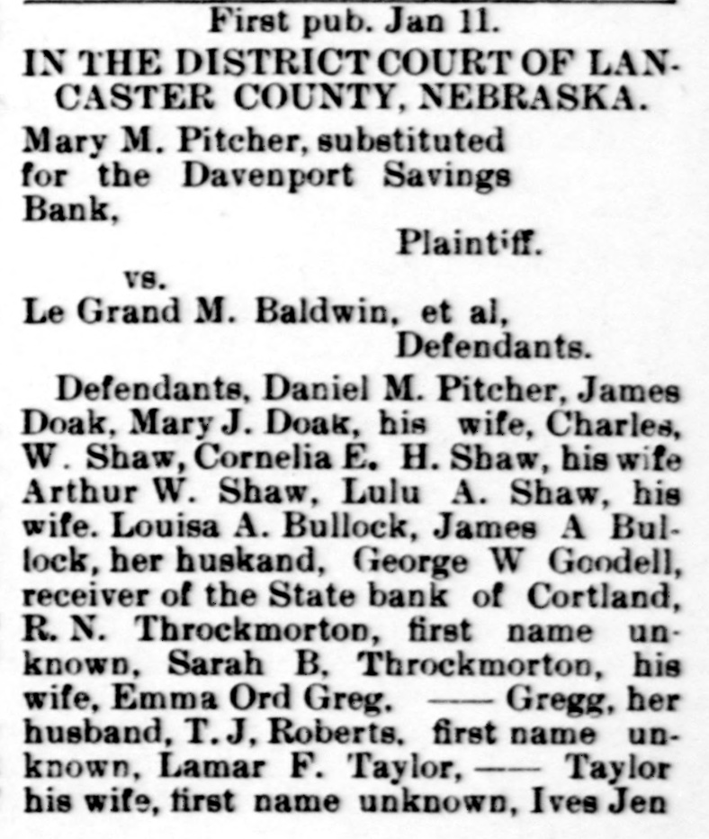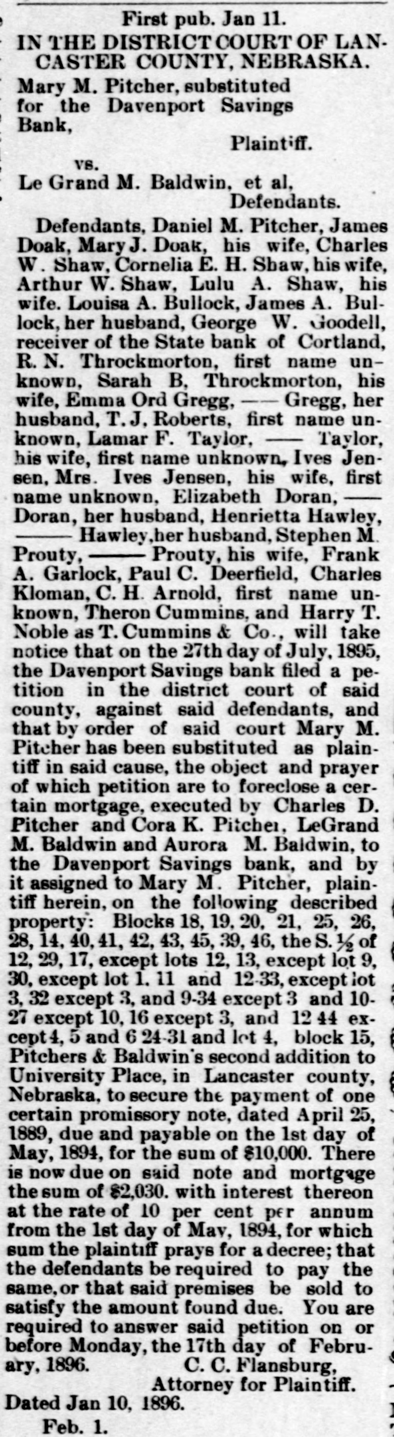 First pub. Jan 11. # IN THE DISTRICT COURT OF LANCASTER COUNTY, NEBRASKA. Mary M. Pitcher, substituted for the Davenport Savings Bank, Plaintiff. vs. Le Grand M. Baldwin, et al, Defendants. Defendants, Daniel M. Pitcher, James Doak, Mary J. Doak, his wife, Charles W. Shaw, Cornelia E. H. Shaw, his wife, Arthur W. Shaw, Lulu A. Shaw, his wife. Louisa A. Bullock, James A. Bullock, her husband, George W. Goodell, receiver of the State bank of Cortland, R. N. Throckmorton, first name unknown, Sarah B. Throckmorton, his wife, Emma Ord Gregg, Gregg, her husband, T. J, Roberts, first name unknown, Lamar F. Taylor, Taylor, his wife, first name unknown, Ives Jensen, Mrs. Ives Jensen, his wife, first name unknown, Elizabeth Doran, Doran, her husband, Henrietta Hawley, Hawley, her husband, Stephen M. Prouty, Prouty, his wife, Frank A. Garlock, Paul C. Deerfield, Charles Kloman, C. H. Arnold, first name unknown, Theron Cummins, and Harry T. Noble as T. Cummins & Co., will take notice that on the 27th day of July, 1895, the Davenport Savings bank filed a petition in the district court of said county, against said defendants, and that by order of said court Mary M. Pitcher has been substituted as plaintiff in said cause, the object and prayer of which petition are to foreclose a certain mortgage, executed by Charles D. Pitcher and Cora K. Pitcher, LeGrand M. Baldwin and Aurora M. Baldwin, to the Davenport Savings bank, and by it assigned to Mary M. Pitcher, plaintiff herein, on the following described property: Blocks 18, 19, 20, 21, 25, 26, 28, 14, 40, 41, 42, 43, 45, 39, 46, the S. ½ of 12, 29, 17, except lots 12, 13, except lot 9, 30, except lot 1. 11 and 12-33, except lot 3, 32 except 3, and 9-34 except 3 and 10-27 except 10, 16 except 3, and 12 44 except 4, 5 and 6 24-31 and lot 4, block 15, Pitchers & Baldwin's second addition to University Place, in Lancaster county, Nebraska, to secure the payment of one certain promissory note, dated April 25, 1889, due and payable on the 1st day of May, 1894, for the sum of $10,000. There is now due on said note and mortgage the sum of $2,030. with interest thereon at the rate of 10 per cent per annum from the 1st day of May, 1894, for which sum the plaintiff prays for a decree; that the defendants be required to pay the same, or that said premises be sold to satisfy the amount found due. You are required to answer said petition on or before Monday, the 17th day of February, 1896. C. C. Flansburg, Attorney for Plaintiff. Dated Jan 10, 1896. Feb. 1.