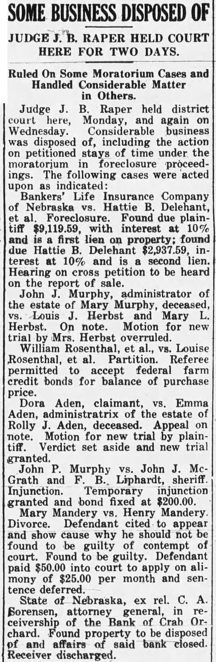RAPER HELD COURT HERE FOR TWO DAYS. Ruled On Some Moratorium Cases and Handled Considerable Matter in Others. Judge Raper held district court here, Monday, and again on Wednesday. Considerable business disposed of, including the action on petitioned stays of time under the in proceedings. The following cases were acted upon indicated: Bankers Life Insurance Company Nebraska Hattie Delehant, Found due plaintiff with interest 10% and first lien on property; due Hattie Delehant $2,937.59, interest at 10% and lien. Hearing on cross petition to be heard on the report of sale. John Murphy, administrator of the estate of Mary Murphy, deceased, Louis Herbst and Mary Herbst. On note. Motion for new trial Mrs. Herbst overruled. William Rosenthal, Louise Rosenthal, Partition. Referee permitted accept federal farm credit bonds for balance of purchase price. Dora Aden, claimant, Emma Aden, administratrix of the estate of Rolly Aden, deceased. Appeal on note. Motion for new trial by plaintiff. Verdict set aside and new trial granted. John Murphy VS. John McGrath and Liphardt, sheriff Injunction. Temporary injunction granted and bond fixed at $200.00. Mary Mandery Henry Mandery Divorce. Defendant cited appear and show cause why he should found be guilty contempt of Found to be guilty. Defendant paid $50.00 into court to apply on alimony of $25.00 per month and sentence deferred. State of Nebraska, ex rel. Sorensen, attorney general, ceivership of the Bank of Crab chard. Found property to be disposed and affairs said bank closed. Receiver discharged.
