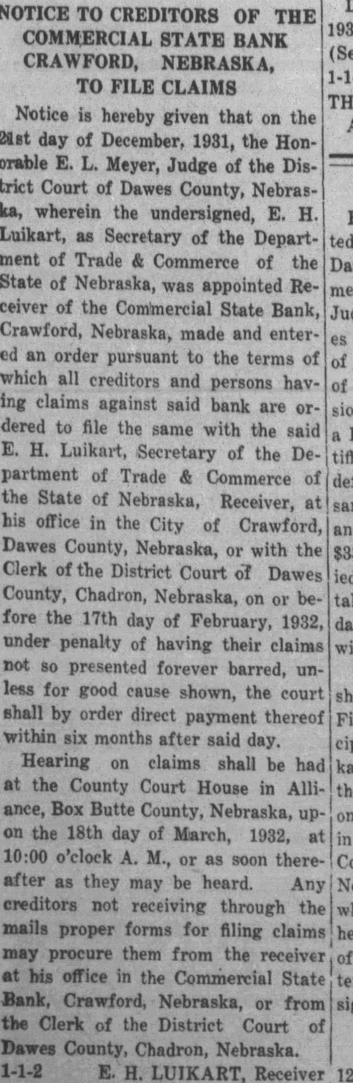 NOTICE TO CREDITORS OF THE COMMERCIAL STATE BANK CRAWFORD, NEBRASKA, TO FILE CLAIMS Notice is hereby given that on the 21st day of December, 1931, the Honorable E. L. Meyer, Judge of the District Court of Dawes County, Nebraska, wherein the undersigned, E. H. Luikart, as Secretary of the Department of Trade & Commerce of the State of Nebraska, was appointed Receiver of the Commercial State Bank, Crawford, Nebraska, made and entered an order pursuant to the terms of which all creditors and persons having claims against said bank are ordered to file the same with the said E. H. Luikart, Secretary of the Department of Trade & Commerce of the State of Nebraska, Receiver, at his office in the City of Crawford, Dawes County, Nebraska, or with the Clerk of the District Court of Dawes County, Chadron, Nebraska, on or before the 17th day of February, 1932, under penalty of having their claims wit: not so presented forever barred, unless for good cause shown, the court shall by order direct payment thereof within six months after said day. Hearing on claims shall be had at the County Court House in Alliance, Box Butte County, Nebraska, upon the 18th day of March, 1932, at 10:00 o'clock A. M., or as soon thereafter as they may be heard. Any creditors not receiving through the mails proper forms for filing claims may procure them from the receiver at his office in the Commercial State Bank, Crawford, Nebraska, or from the Clerk of the District Court of Dawes County, Chadron, Nebraska. 1-1-2 E. H. LUIKART, Receiver
