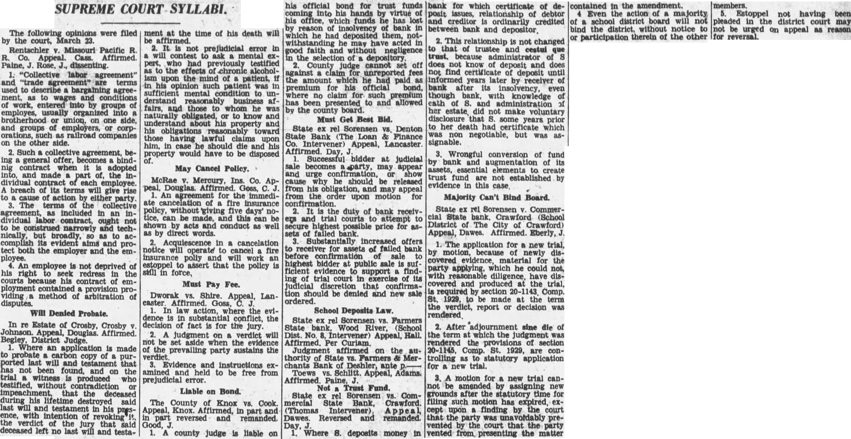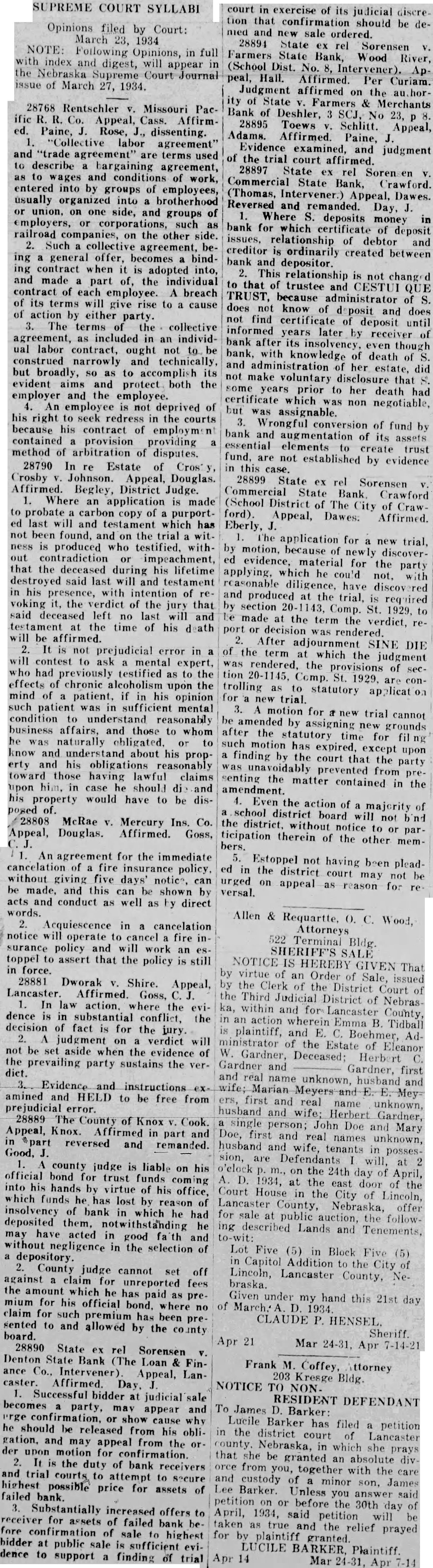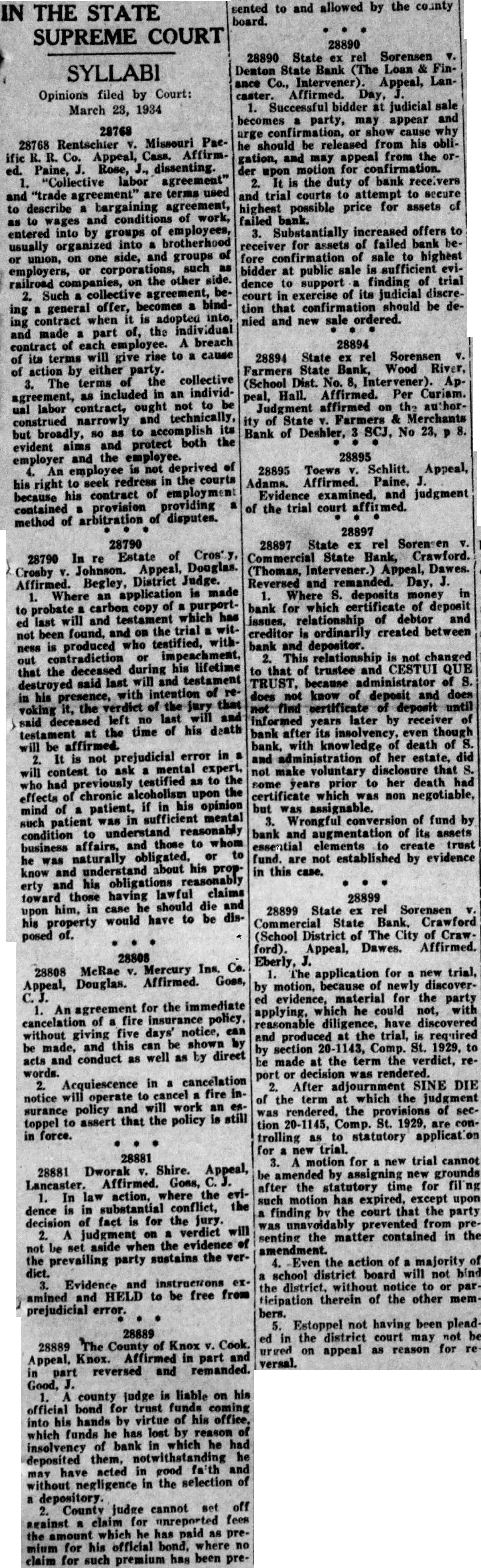 Opinions filed by Court: March 23, 1934 NOTE: Following Opinions, in full with index and digest, will appear in the Nebraska Supreme Court Journal issue of March 27, 1934.